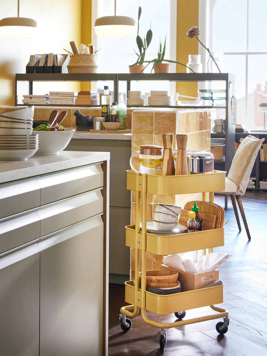 廚房手推車可以到處移動,令下廚更得心應手。顏色相襯的手推車附有活輪,可以兼作廚房島形工作檯,不但是存放廚房常用物品的實用之選,更可以把食物、飲品和餐具運到餐檯旁。