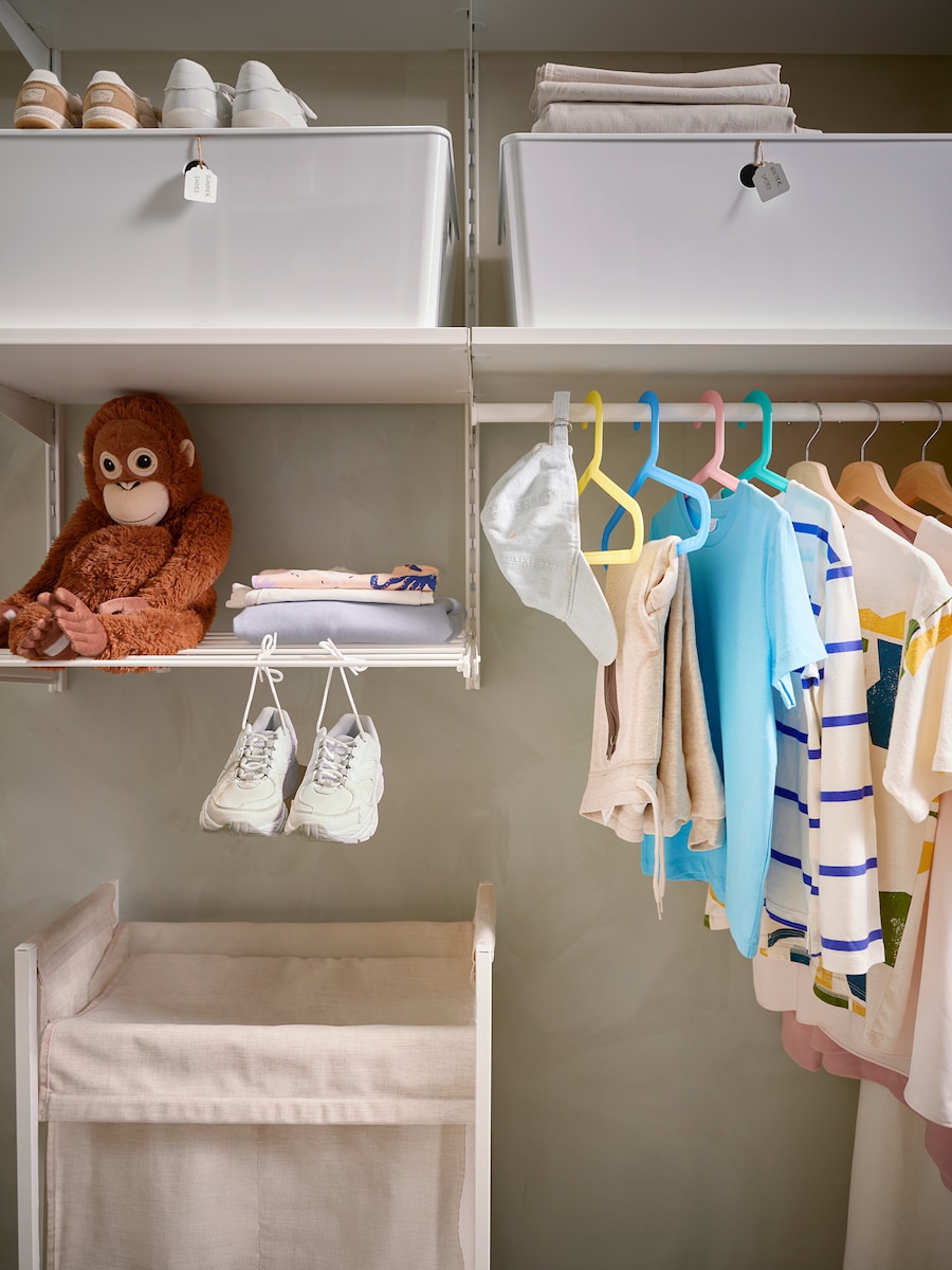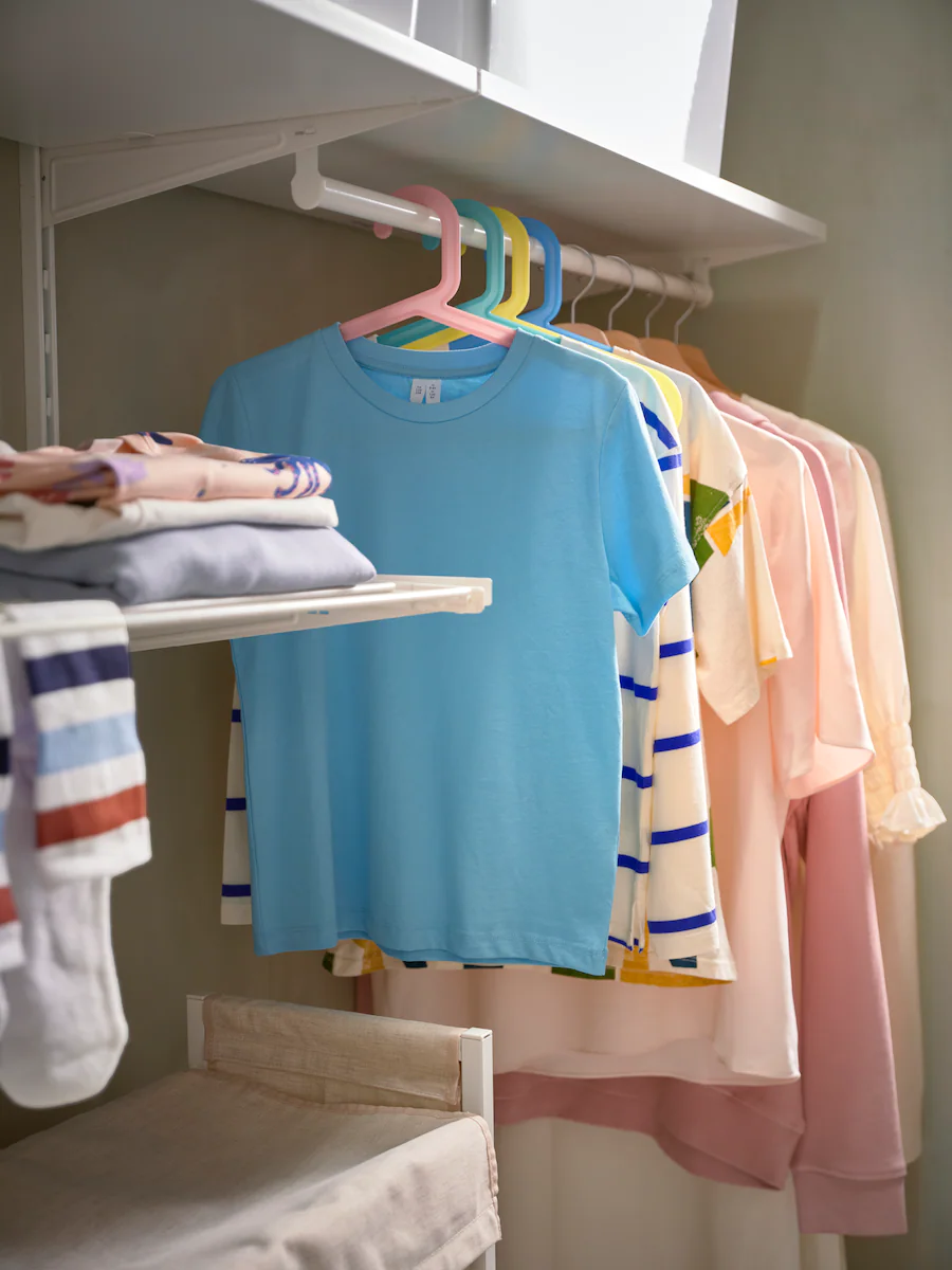晾衣架可以晾乾小朋友的足球裝備,掛在剛洗好的毛公仔旁邊,同時滿足晾衫和收納衣物的需要。為父母和孩子衣物選用不同顏色的衣架,分類整理時就更加方便,再也不會拿錯。