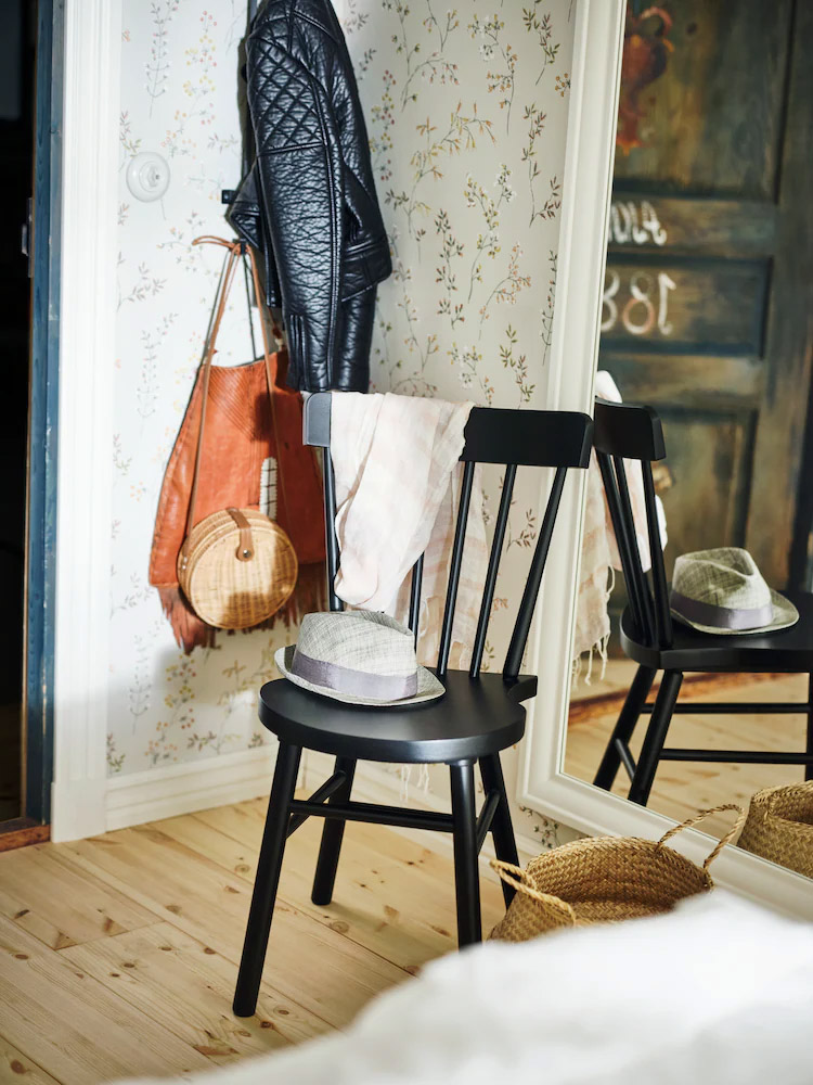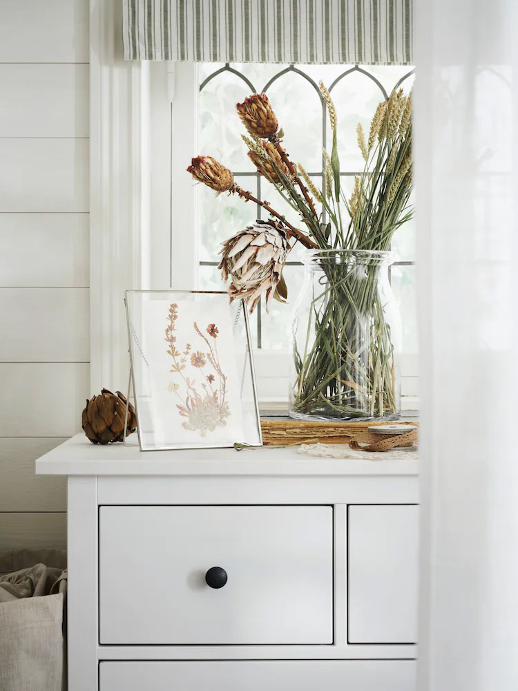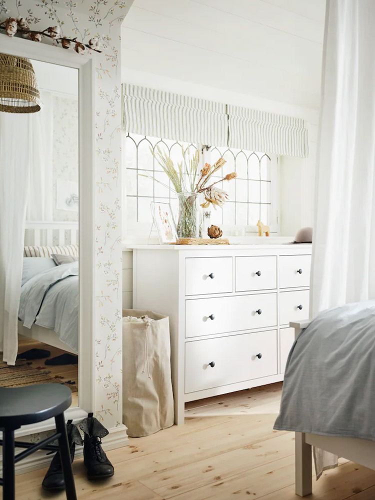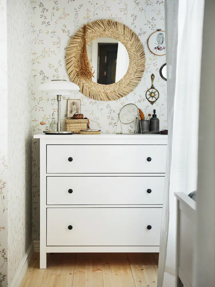 HEMNES 睡房系列以純白木材和優雅傳統風格,打造簡潔和諧的佈置,方便隨時添加個人特色。三層抽屜櫃上擺放圓形鏡子和弧形燈具,令整體佈置更加柔和。 |