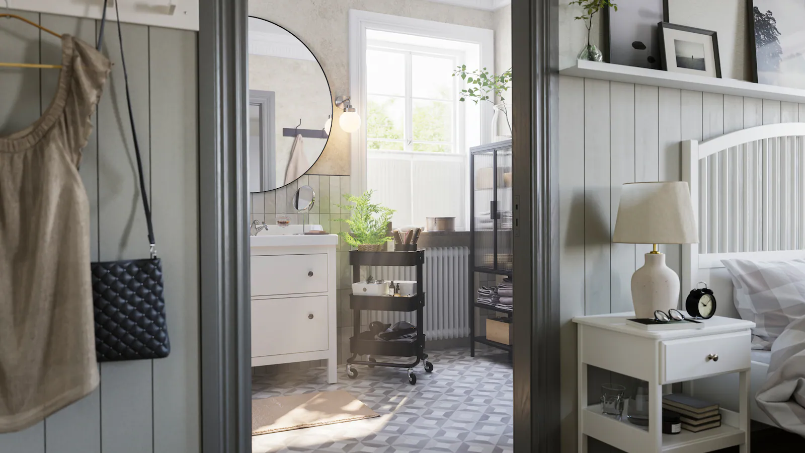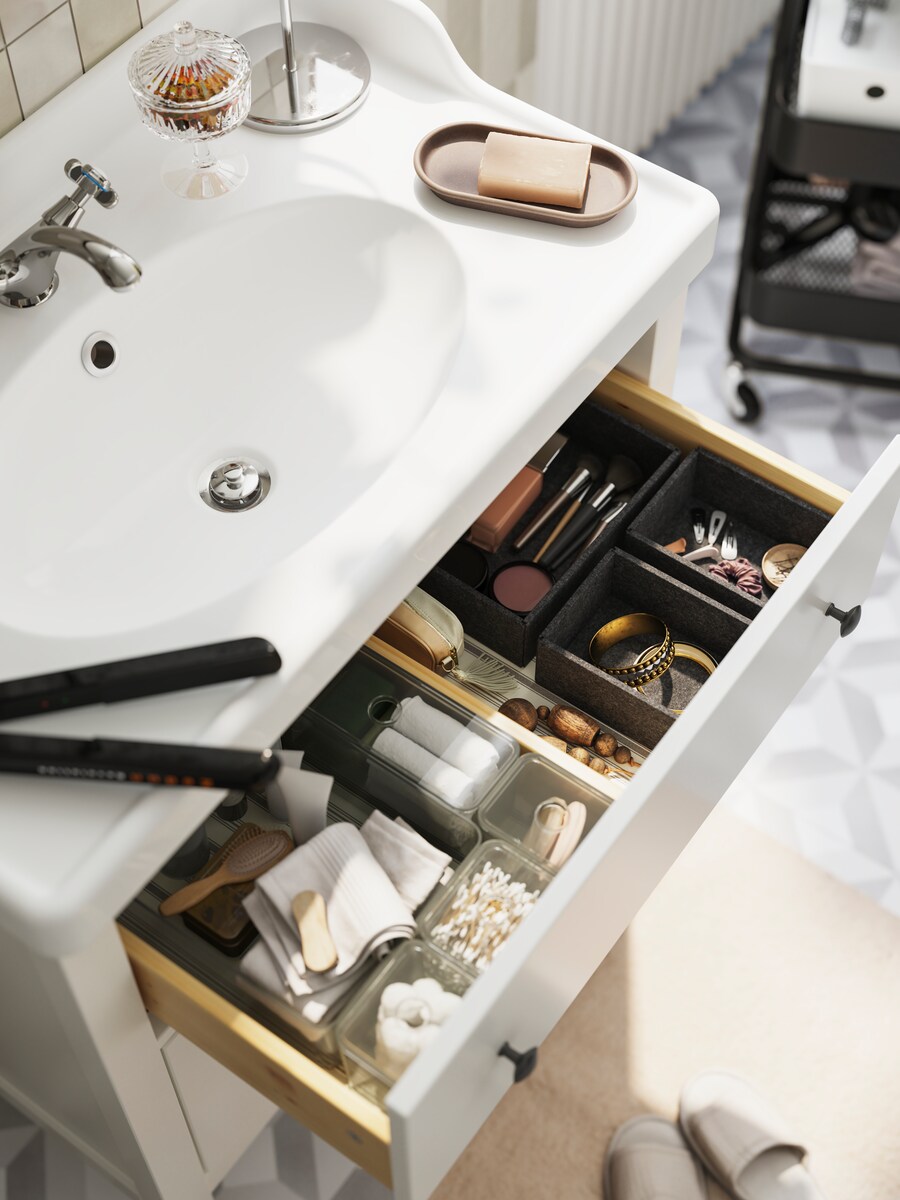 妥善規劃儲物位置,才能打造整潔井然的浴室。洗手盆下的抽屜配合內部整理配件,便能分類存放和藏起瑣碎的雜物,其他浴室用品則可放在層架或活動几上(想享受放鬆身心的浸浴時,只需要將活動几推到浴缸旁邊)。
