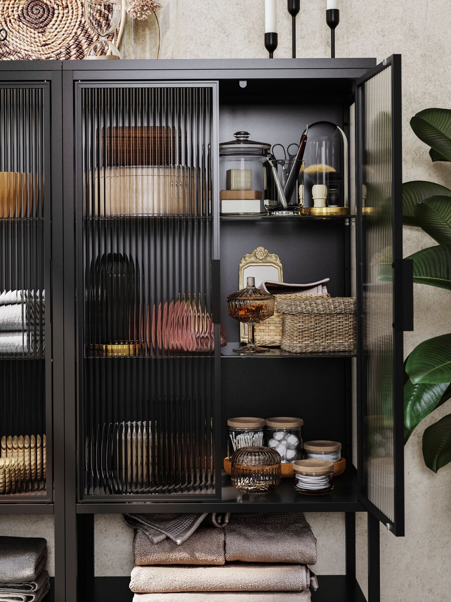 半透明的櫃門可以展示精緻的香水瓶和容器,使浴室櫃能成為整體布置的一部分,同時保持物品井然有序,方便取用。下面的開放式層架可以擺放毛巾,也能擺放天然竹製儲物盒,為空間增添暖意。