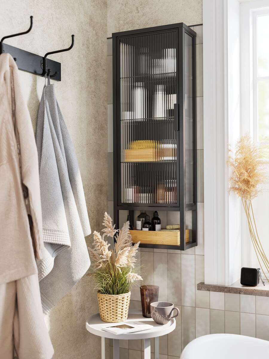 將物品存在淺身的吊櫃內,就能善用閒置的角落。鋼化玻璃櫃門確保物品一目了然,也能美化浴室。需要掛起毛巾或浴袍?在浴缸附近安裝層架連掛鈎,便能滿足所需。