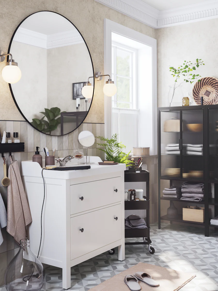 半透明儲物櫃完美配搭白色洗手盆櫃,以及散發經典復古氣息的黑色配件。這間浴室的布置高雅時尚,同時帶有一絲傳統魅力,展現獨特個性之餘,亦兼具實用的儲物功能。