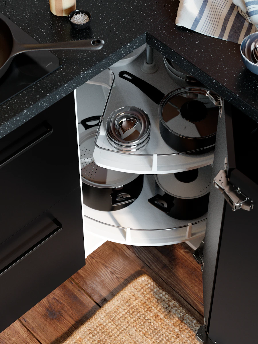 碳黑色的門板顯得現代前衛,配上溫馨的木質地板、天花板和上櫃的門板,便是充滿個性、永不過時的廚房設計。綠色的植物、瓷磚和檯面除了營造溫暖的氣氛,也注入了自然色彩。