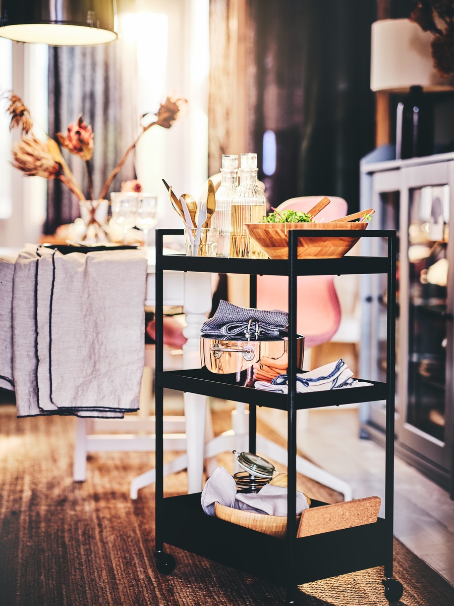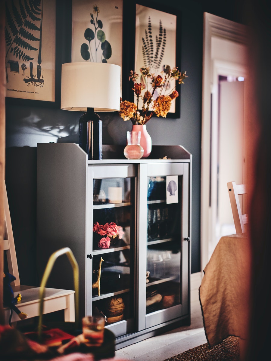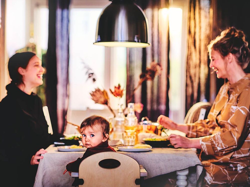 在這間小公寓裡,飯廳是全家人的聚腳點。只要選用高腳椅以至符合人體工學的椅子等各式座椅,便能照顧所有人和各類活動的需要。陳列櫃內的擺設和植物畫作展現個人風格,而活動几和其他多用途家品,則全面提升實用功能。