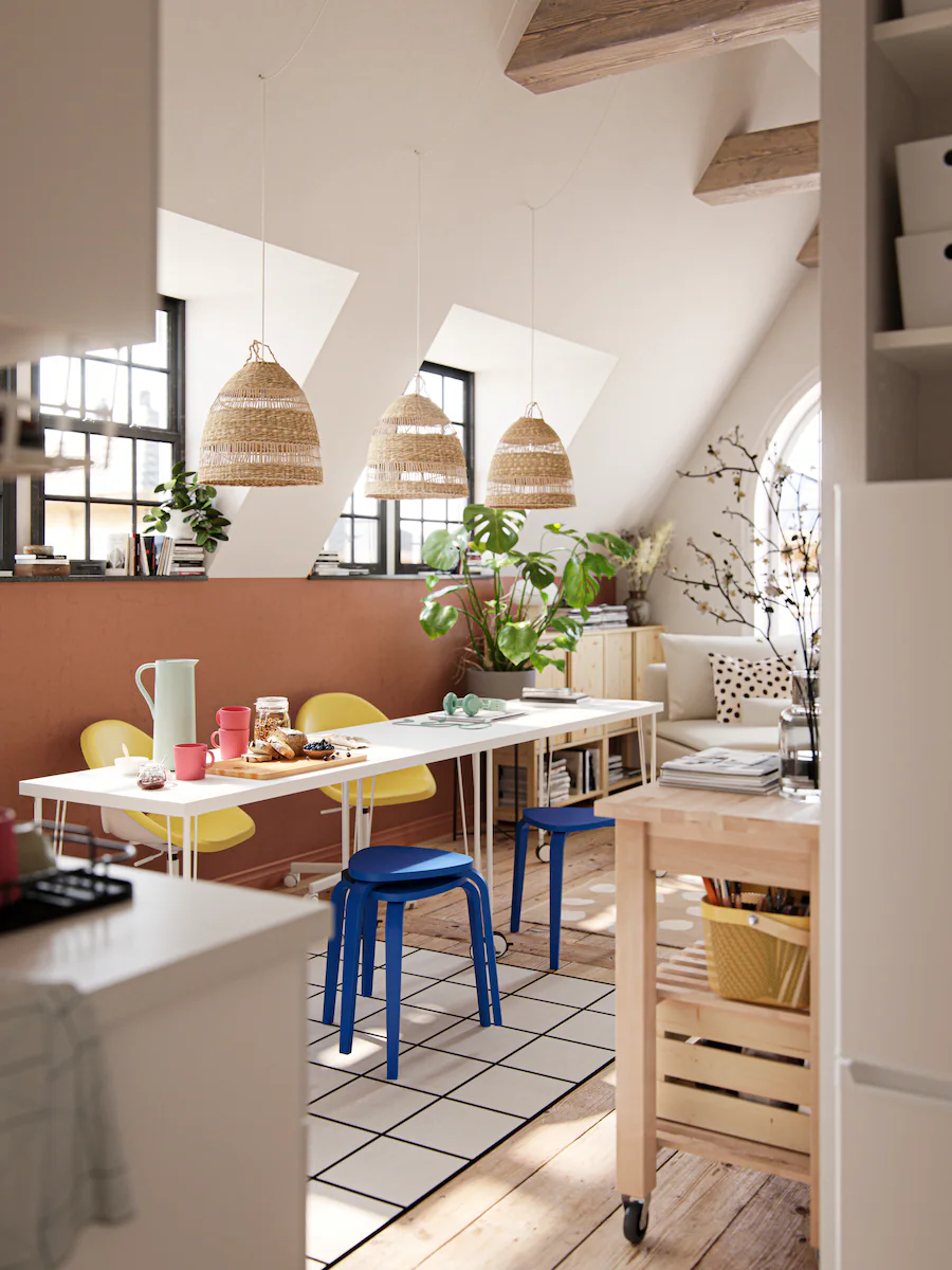 這間適合居家辦公(和遊戲)的套房善用空間,選用可堆疊的椅凳和帶輪的餐桌,讓你恣意穿梭於工作和娛樂之間。天然材料製成的推車和燈具可增添一絲靜謐感,而椅凳及椅子則顯得格外出彩。