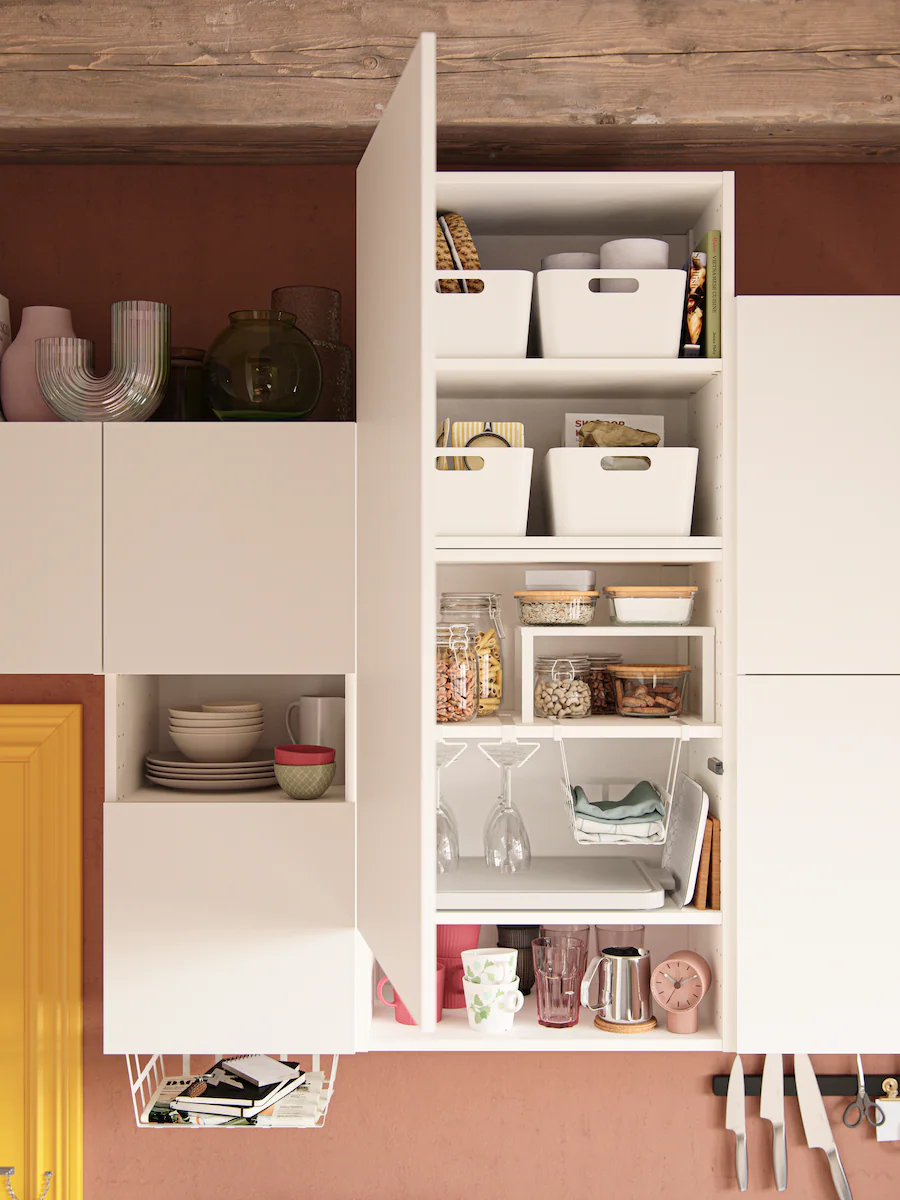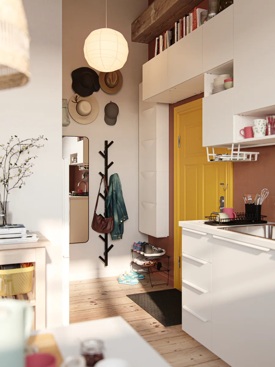 彆扭的空間也能是創意收納的起點。我們結合開放式和封閉式的收納,收起日常用品的同時,也能展示裝飾品。既然空間有限,不如將廚房延伸至玄關,製造更多收納空間?