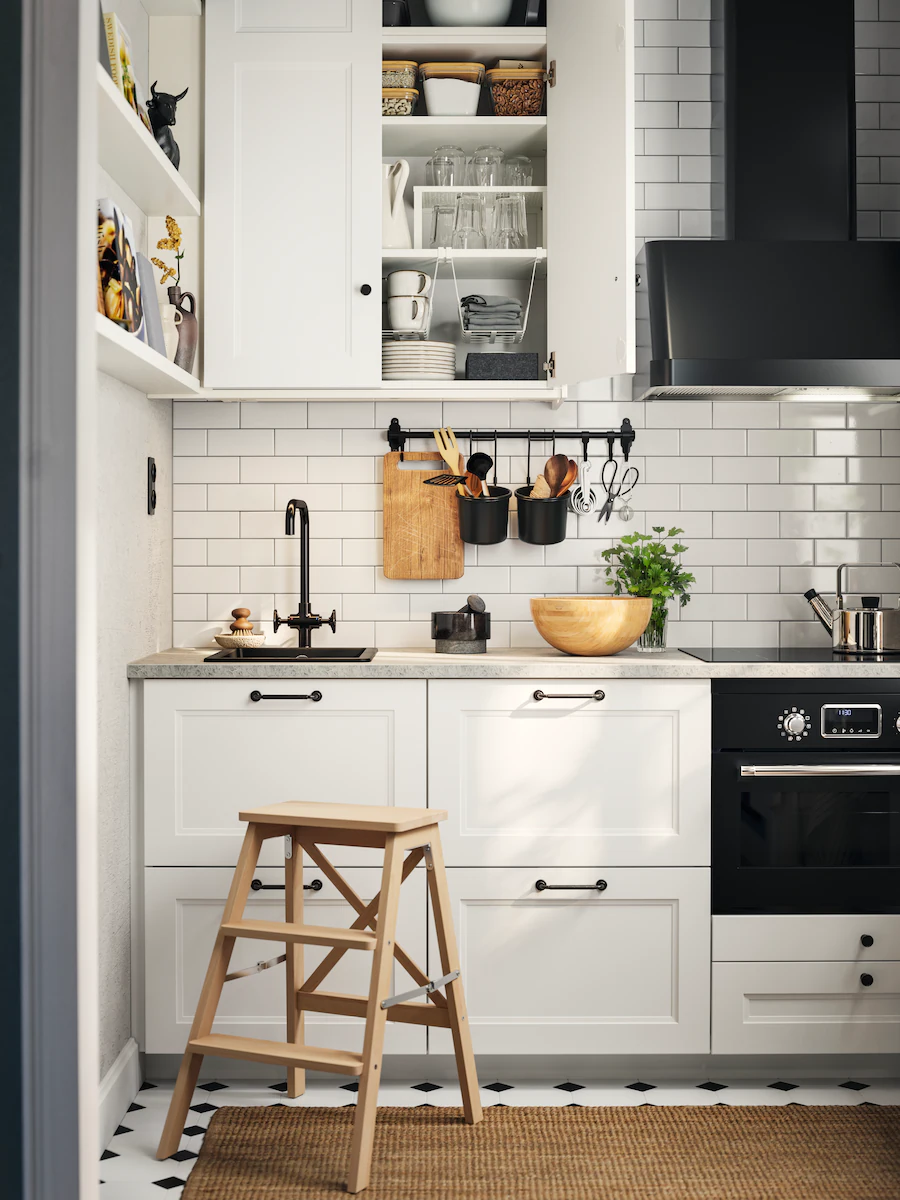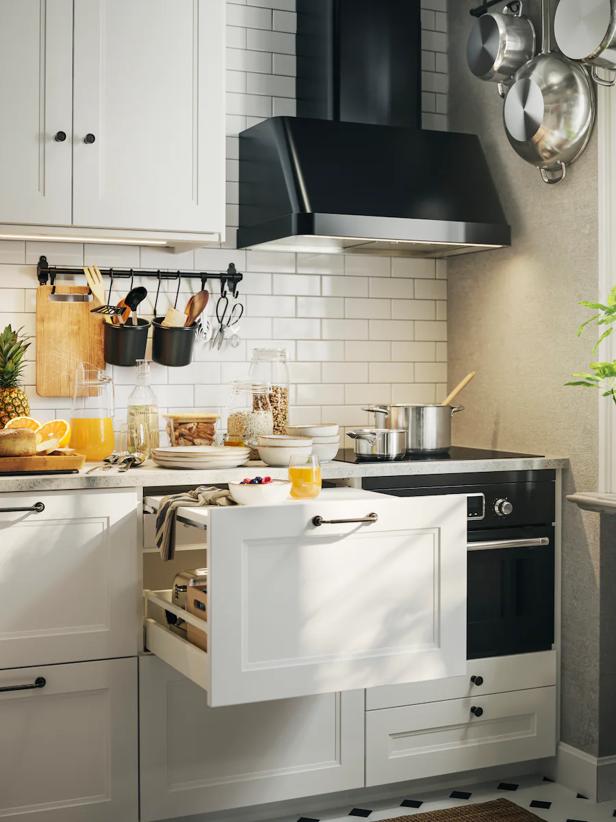 保持櫃台板整齊,便有空間大展廚藝。牆上的掛桿為傳統風格的廚房增添溫馨感覺,也確保常用的廚具近在手邊。只要使用頂部抽屜內的拉出式層板,即可變出額外的工作空間。