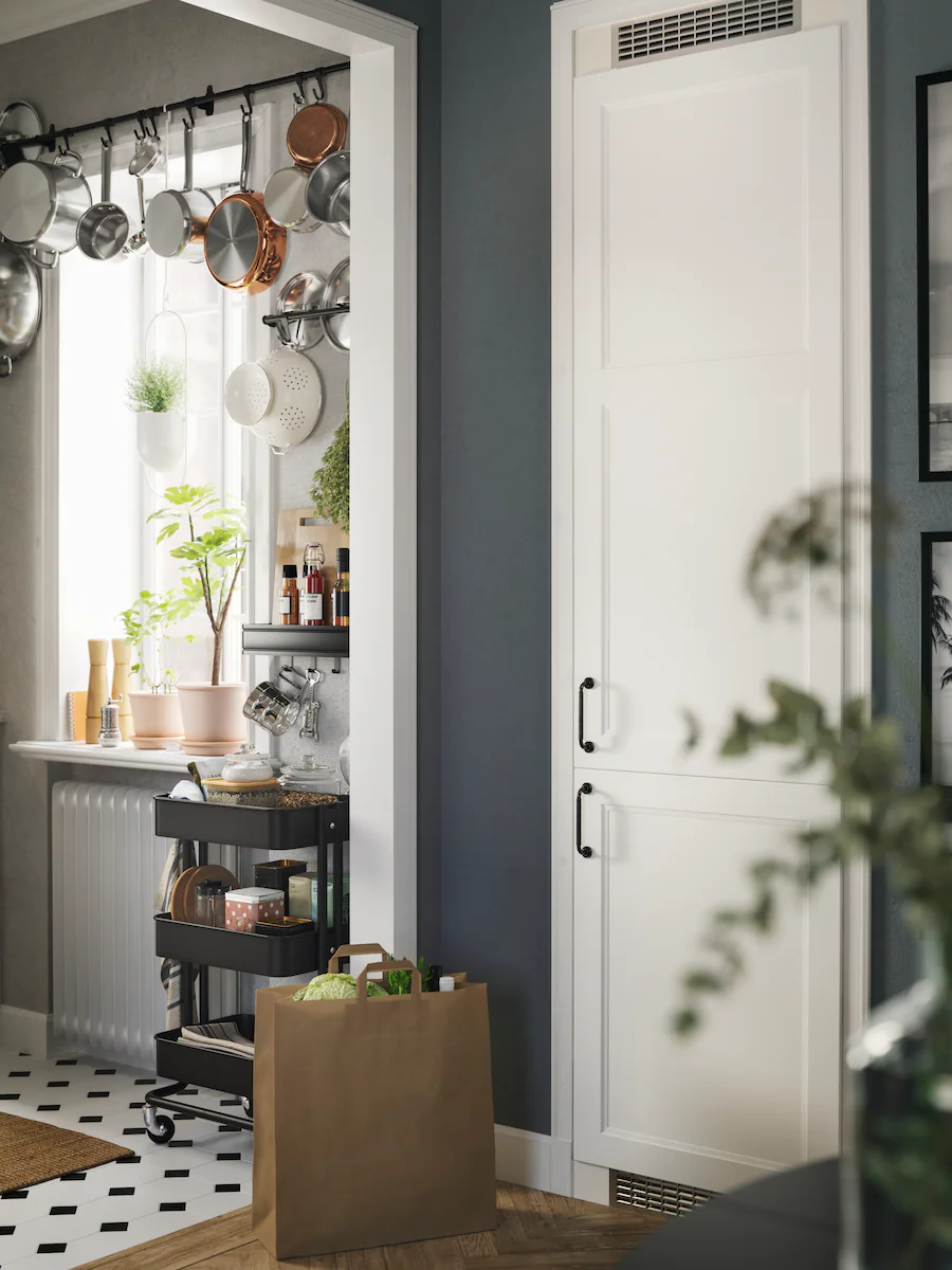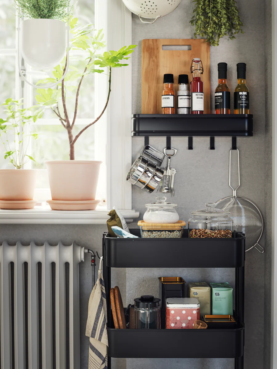 當空間狹窄,便要嘗試創新的方案。這個廚房將鍋鑊當作窗簾掛在窗戶上方。你可以用掛鈎掛起任何物品,將食物盒放在層架上,再用靈活的活動几整齊收納其餘物品,而雪櫃/冰櫃就在轉角處。
