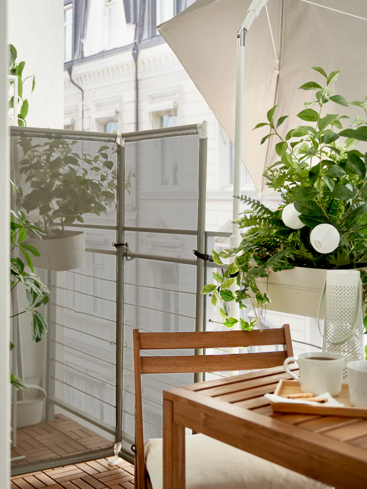 提高私隱度的屏風靈活變成間隔,劃分聚會空間,一面能讓大家在遮陽傘下相聚聊天,享用茶點,感覺悠閒;另一面則是實用的洗衣區。巧妙分隔空間,便能擁有更寫意的生活。