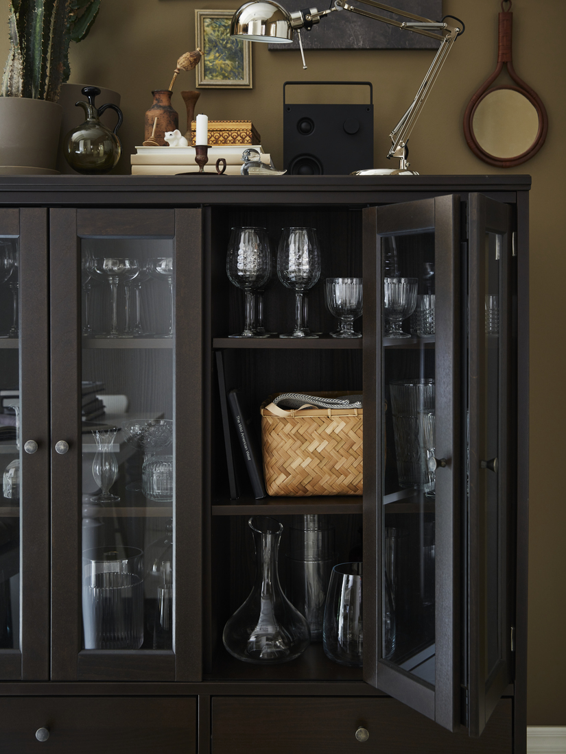 風格傳統的IDANÄS儲物櫃確保各種餐具近在手邊。玻璃門設計讓你展示心愛的餐具,而餐墊等用品則可藏在抽屜內。雙摺式櫃門打開時只佔少量空間,也為空間增添優雅氣息。