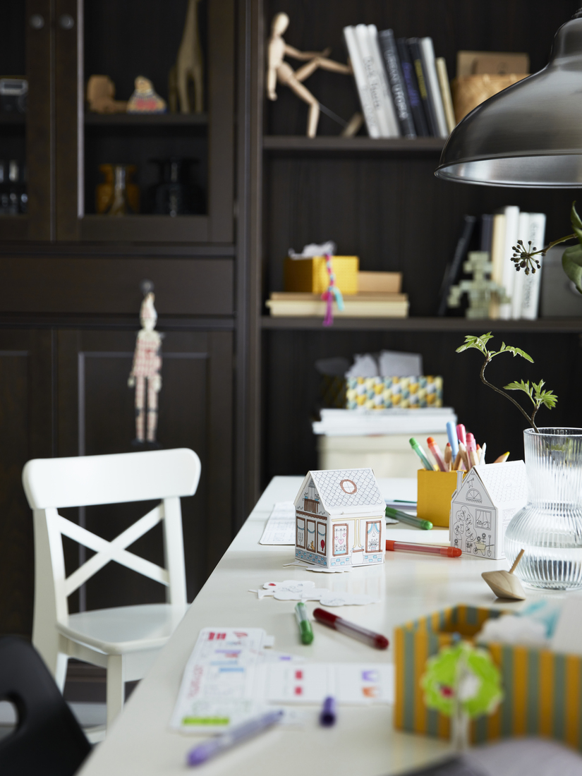 餐檯除了是用餐的地方,也能配合各類親子活動的需要,例如以這套MÅLA硬卡紙城鎮模板,動手建造小城鎮和填色。彩色的LYSMASK儲物盒則可以擺放顏色筆等物品,然後放在IDANÄS書架下層,方便小小建築師能輕鬆拿取。