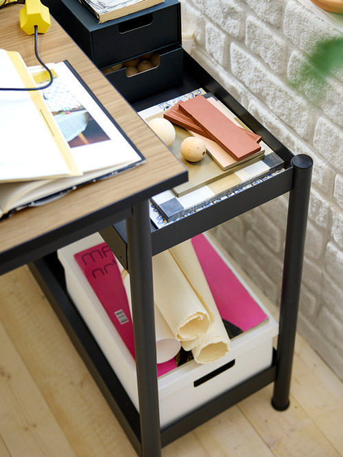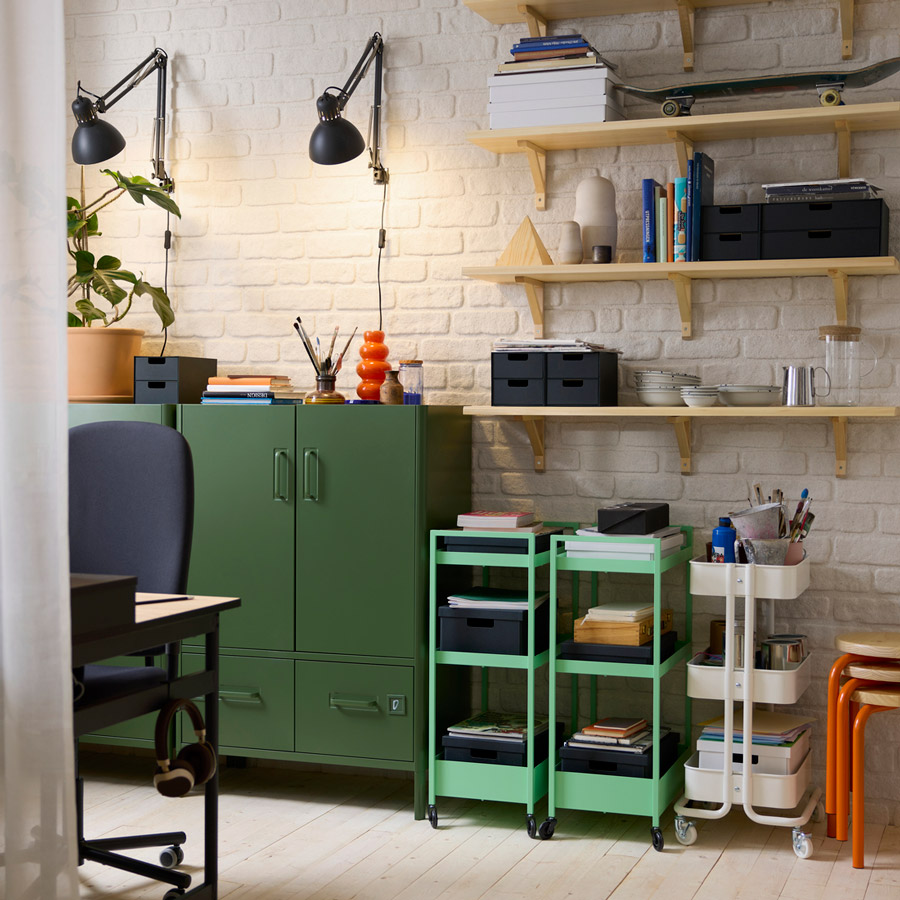 色彩明亮的IDÅSEN 儲物櫃和NISSAFORS活動几能為工作空間增添活力,也令一切保持整齊企理。在家創業的你不妨利用櫃門內側收納收據和重要文件,方便在記帳時隨時取用。即使要與人共用空間,專屬的儲物櫃和層架亦能將你與另一半的文件和物品分開,再也不用在一大堆文件中東翻西找。