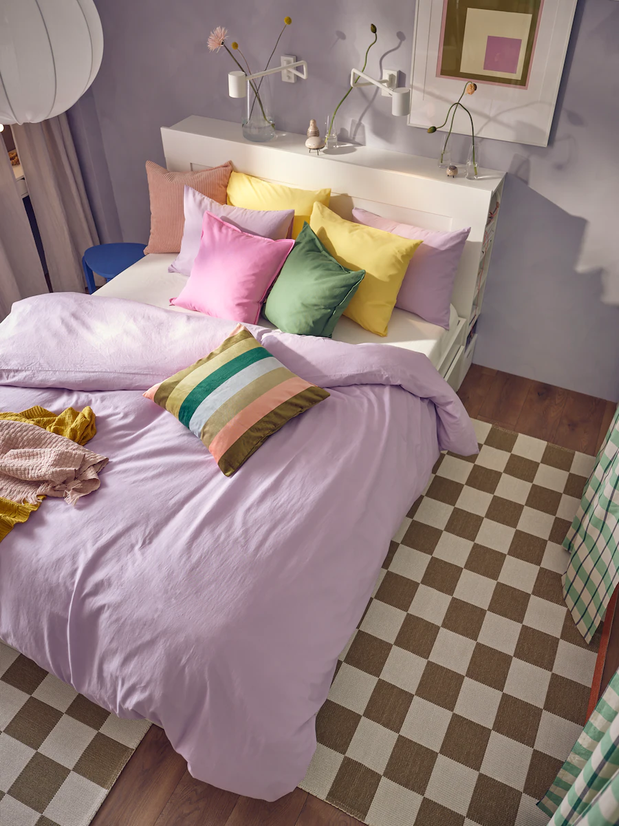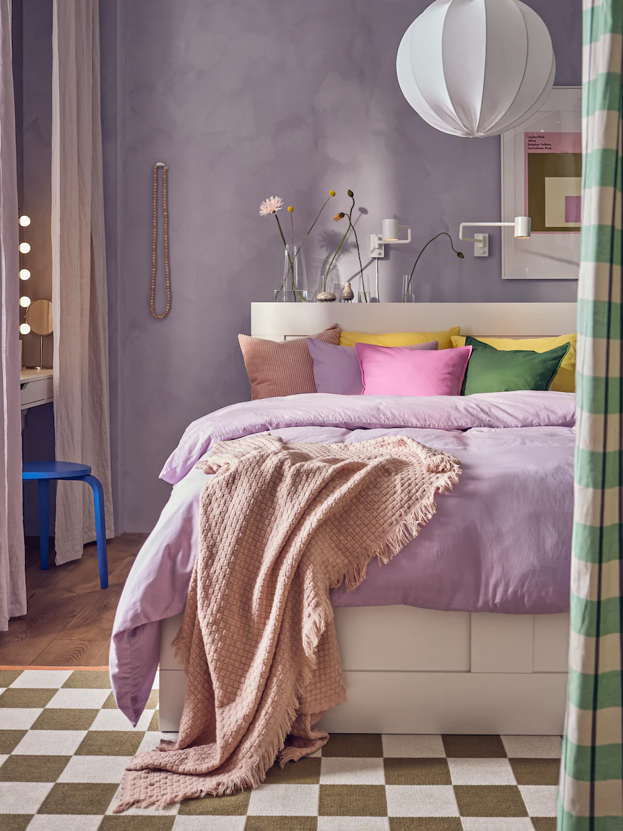 床架各處裝上了抽屜和層架,可謂是收納能力滿分,中性的床架設計加上繽紛的色彩,足以將其打造成睡房的中心。粉色與亮色的混搭能夠調劑椅凳和牆壁的顏色,最後來點花卉點綴,注入一絲大自然的氣息。