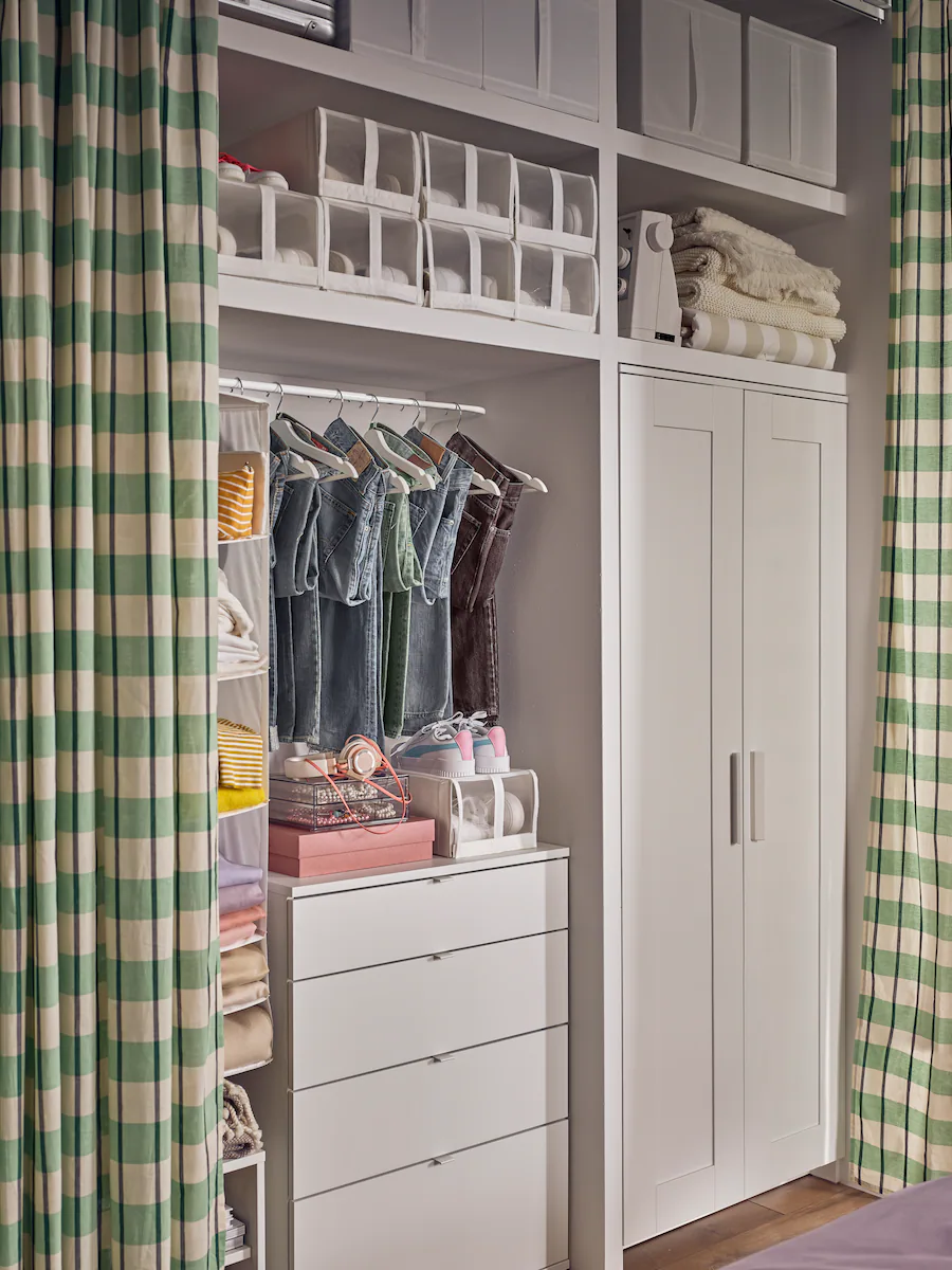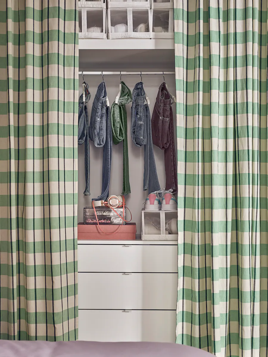 在房間死角裝上各式儲物架,方便收納之餘也能展示喜愛的物品。然而,這裡的亮點莫過於綠色的布簾,只需拉上布簾,便能蓋起儲物架,為房間導入新氣息。