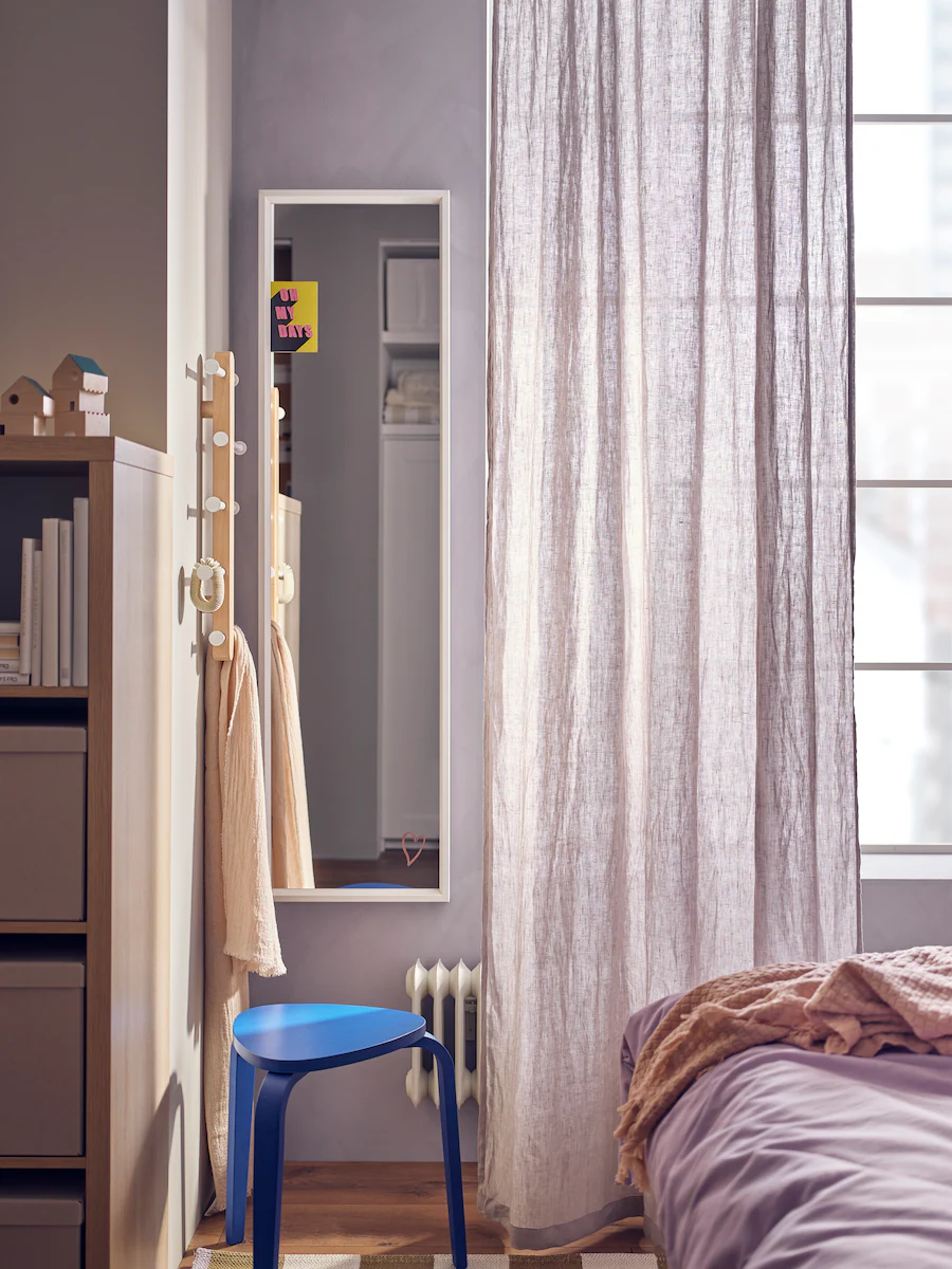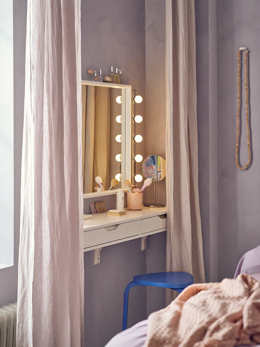 有了這個梳妝台,就可以打扮漂亮出門啦!在粉紫色背景的襯托下,這面以化妝間為靈感的鏡子顯得俏皮可愛,不想出門時只需拉上布簾蓋起。牆壁另一端的鏡子和掛鉤則為「準備出門」的主題構思劃上點睛之筆。