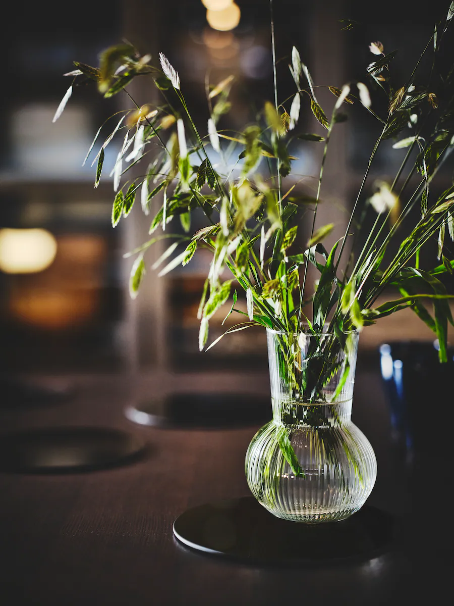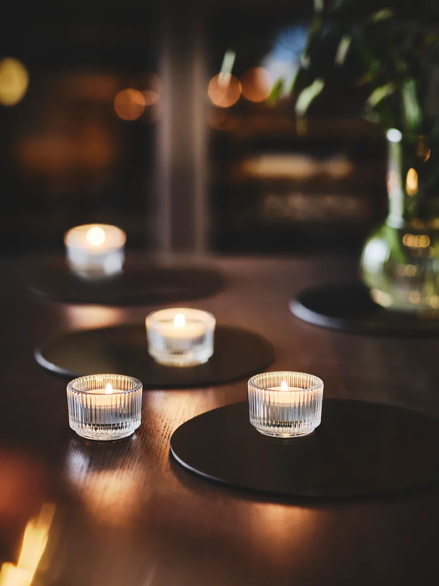 溫暖的燭光特別適合作為餐枱的中央擺設,玻璃蠟燭台和線條紋的玻璃瓶能將光線灑在飯廳毎個角落,製造愜意的氣氛,使慶典晚宴更加閃耀。