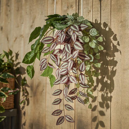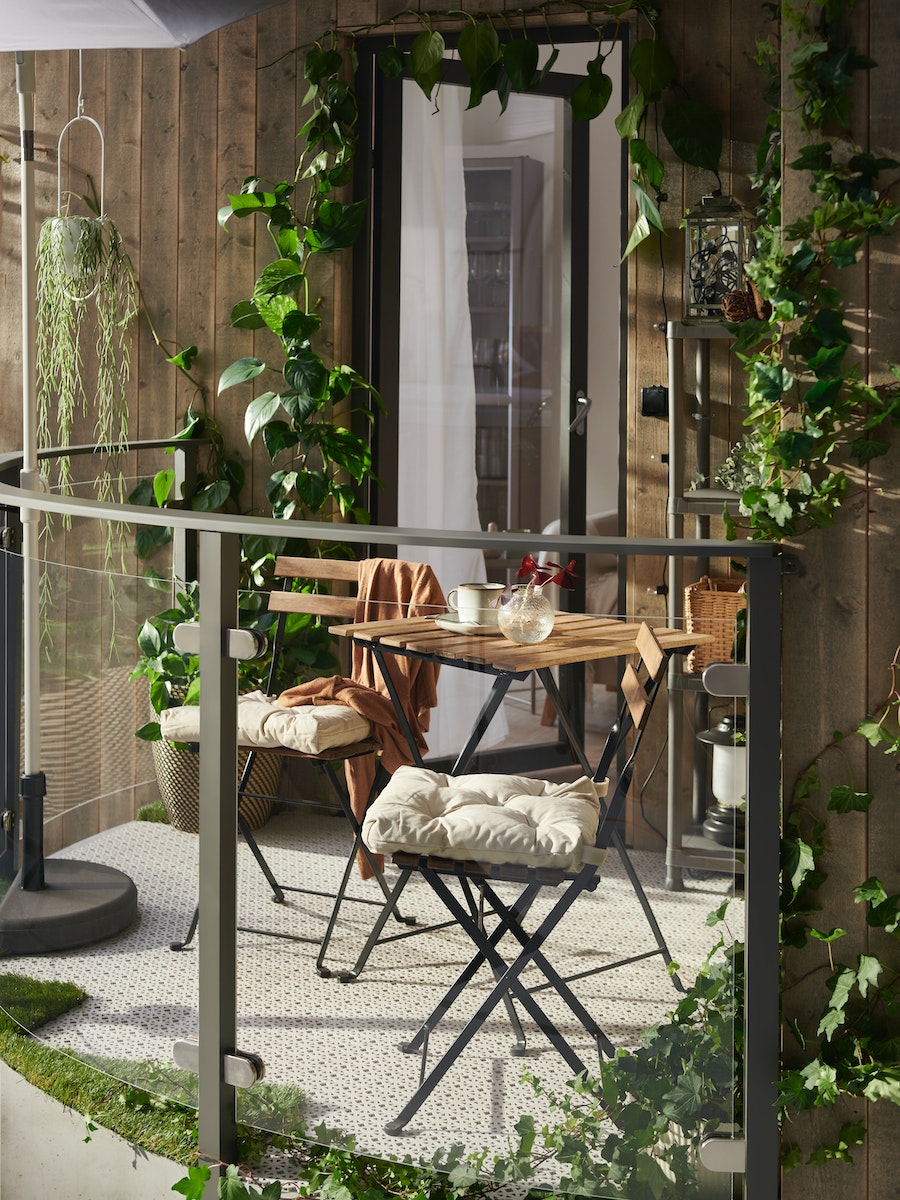 這套餐檯椅組合採用幼細的檯腳和椅腳,並以木材製造,令空間更明亮簡潔,散發暖意。選用的懸掛式盆栽也能營造猶如置身房間之內的感覺。若想有更多空間,只要將檯椅摺起便可。