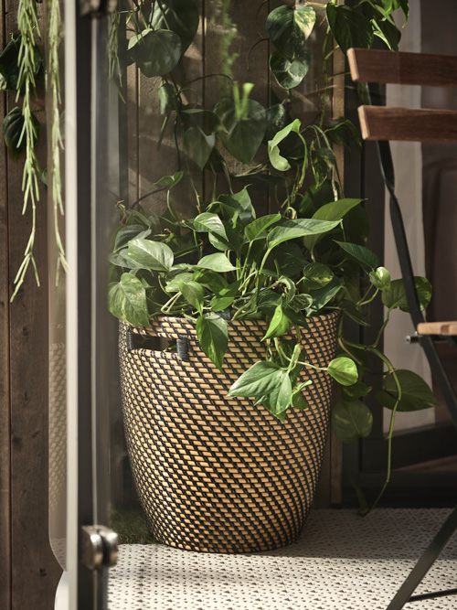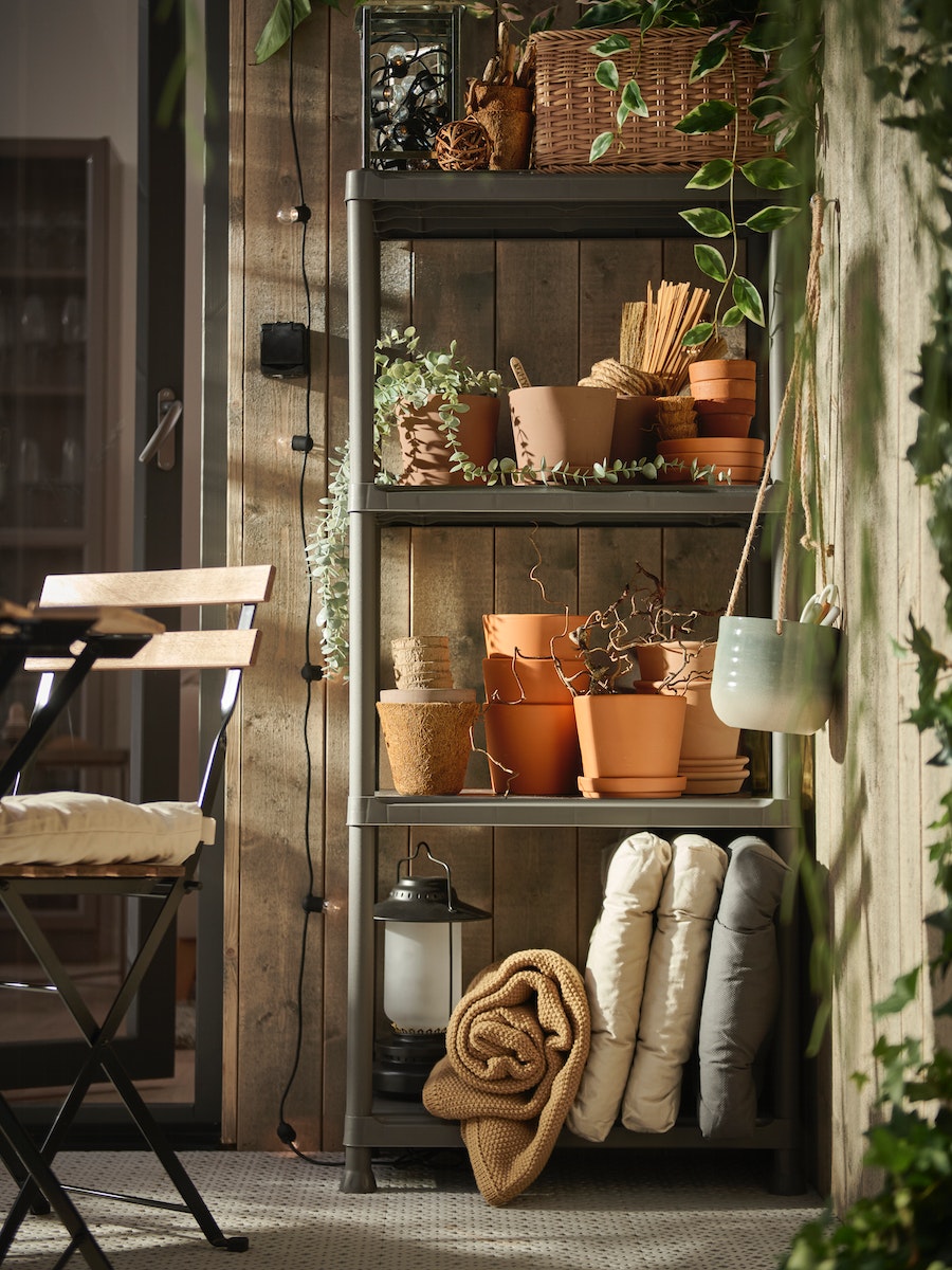 戶外層架除了擺放不想打理的植物,也可以透過展示盆栽和儲物,形成令人眼前一亮的效果。在這個露台裡,我們將裝飾燈串放在燈籠裡,再以蔓生植物塑造田園感覺,同時垂直存放椅墊(像書一樣),方便取用。