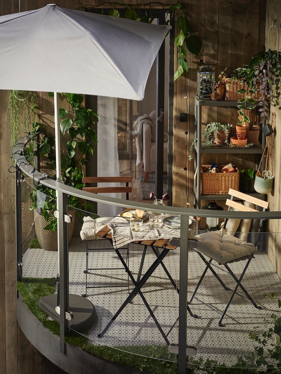 遮陽傘不但能遮擋陽光,更能增加舒適感,在戶外營造猶如獨立房間的感覺。遮陽傘的底座專為小空間而設,可以靠著欄杆平放。加一些懸吊式盆栽、柔和色調和大量燈飾,便能為露台注入寧靜禪意。
