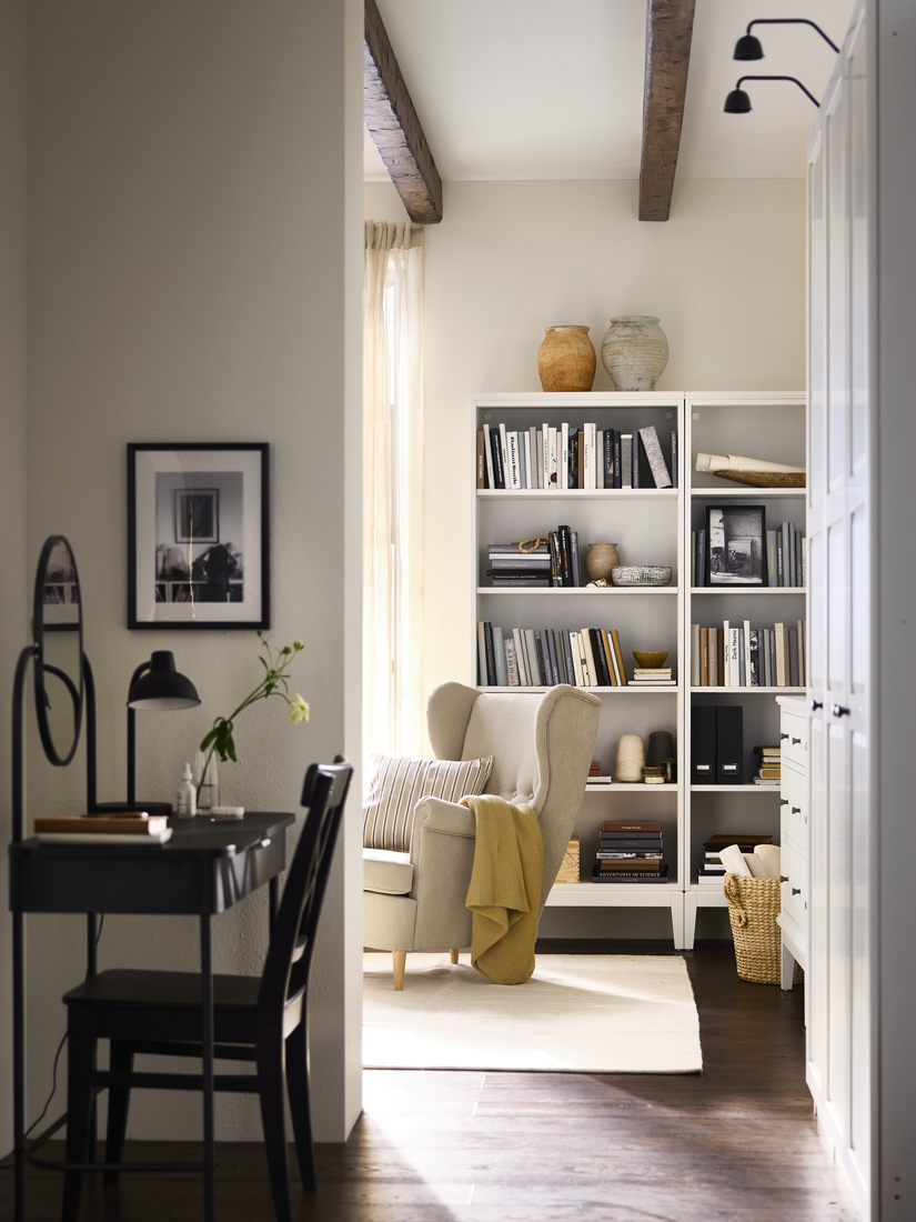 一個書架和一張舒適的扶手椅,卻能帶來驚人的效果。書架可以擺放各類書籍,而無論故事有多長,STRANDMON扶手椅都能讓你坐得舒服。現代人難免會被電視、手提電話和電腦遊戲吸引,但原來一本好書能同樣令讀者和聽眾無法自拔。在睡房中添置書架和扶手椅,是讓人在入睡前放鬆身心的妙法。