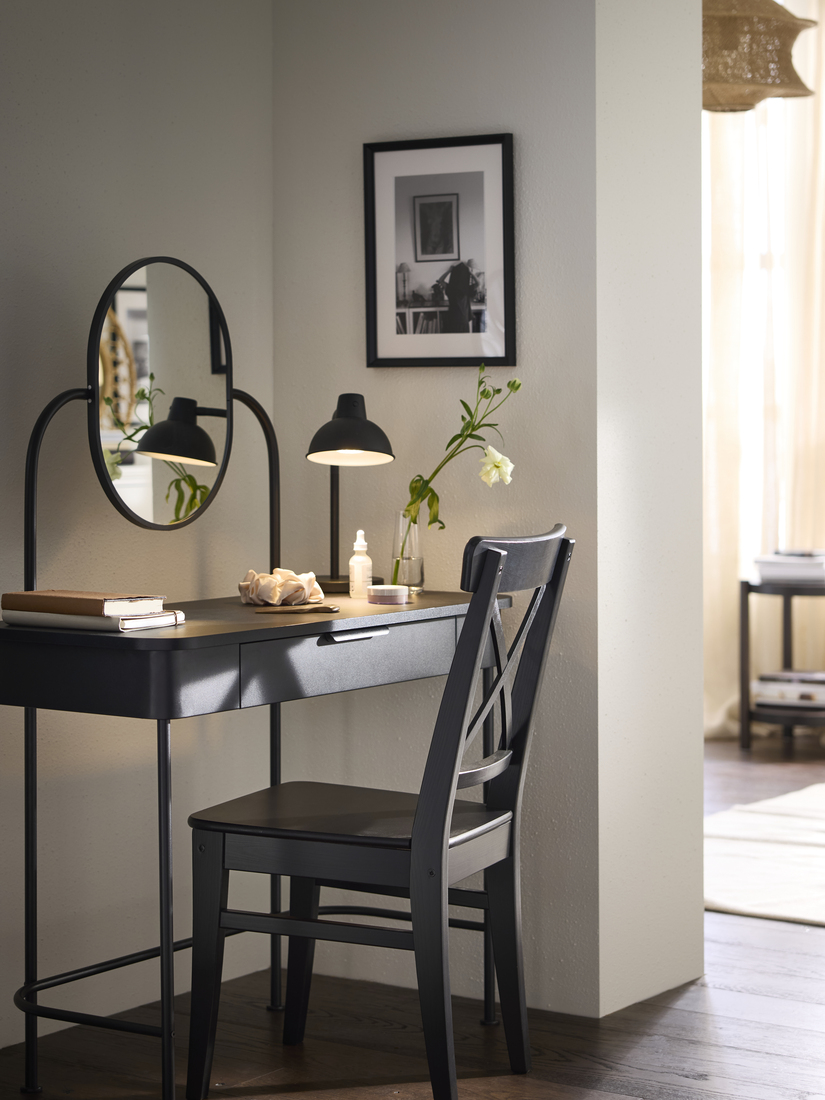 你只需要一個角落和一張GRÅFJÄLLET 梳妝檯。經典與時尚兼備的簡約風格能融入任何狹小空間,也能配合各種風格,讓你花點時間好好照顧自己。只要添置一個書架,不用看書也能為睡房增添寧靜悠閒的氣氛