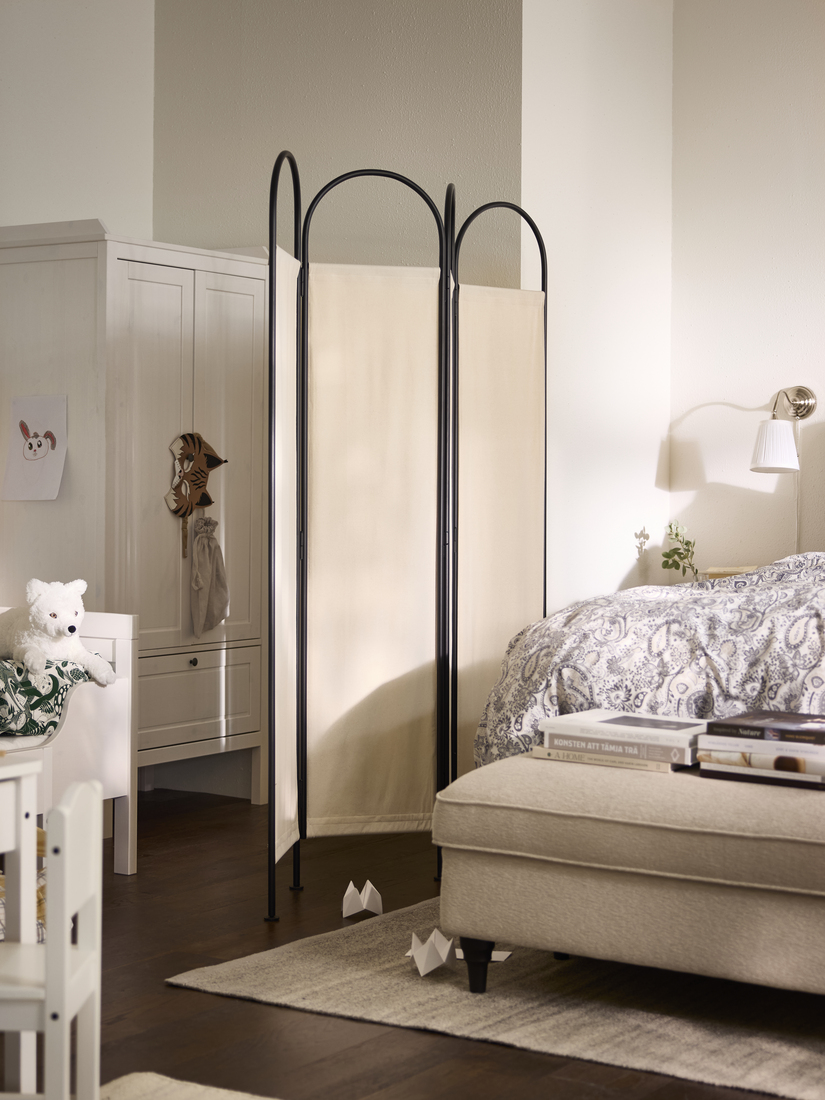 GRÅFJÄLLET屏風可以劃出私人空間,成為晚上休息安睡的好地方。當早上大家起床和開始活動時,只要幾秒便能將屏風摺好收起。屏風的布料容易拆下,方便隨時轉換不同款式!