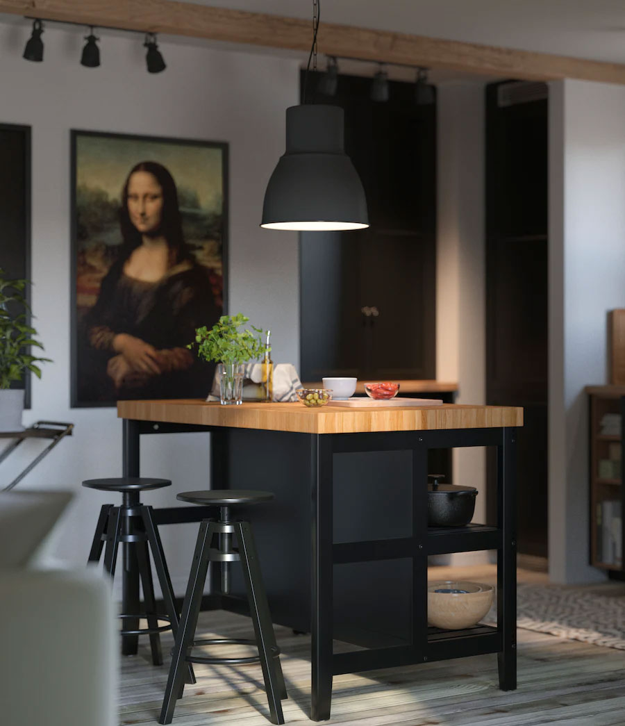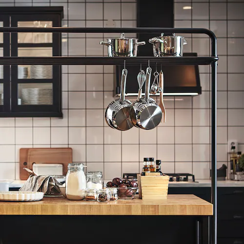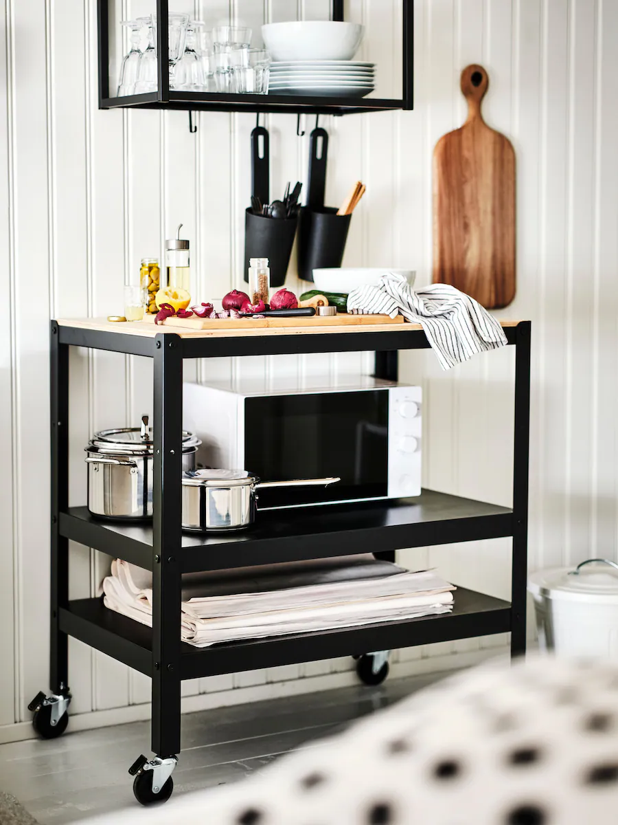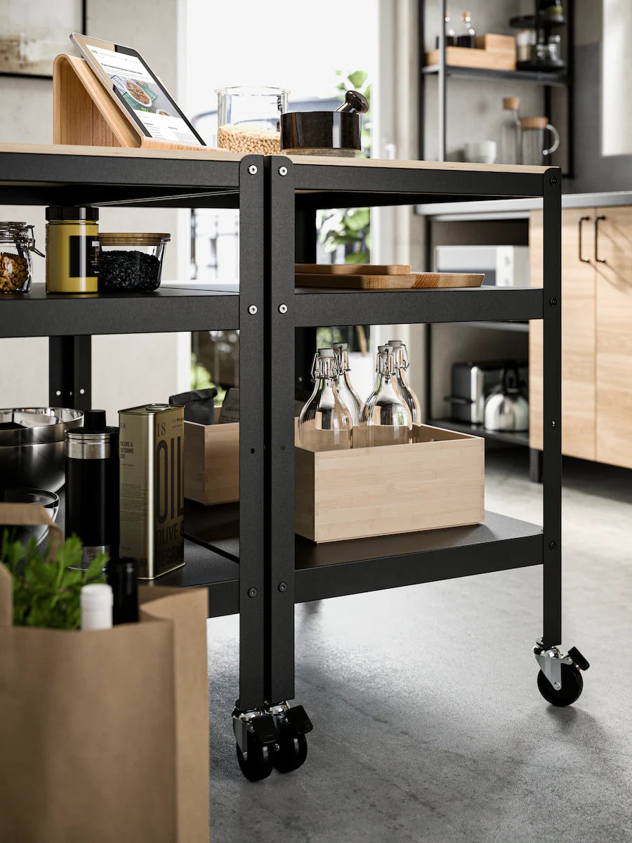 附有四個滾輪的活動几(你也可以稱之為活動廚房工作檯)外型簡約,黑色鋼製框架卻能抵禦濕氣和負重,比想像中更實用。活動几既可單獨使用,也可將兩架活動几並排擺放,變出更多儲物空間和工作檯面,靈活配合需要。
