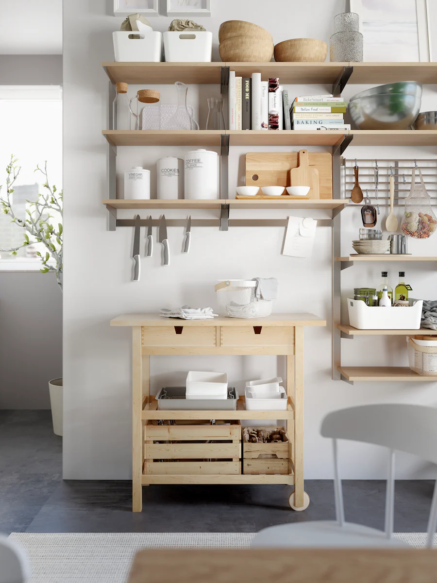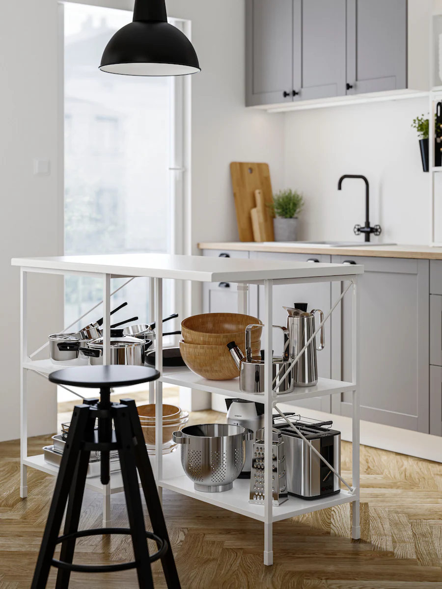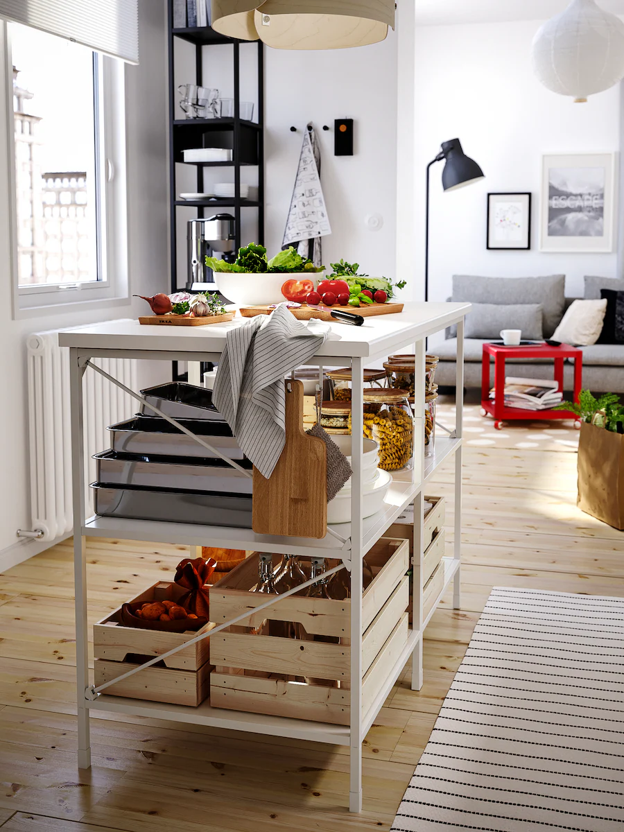 如果你喜歡比傳統廚房工作檯更簡單的設計,可以選擇放一、兩架時尚的活動几,即時在廚房中央變出全新的空間,配合你休閒或準備美食的需要。如果空間有限,你更可以可將活動几靠牆擺放,需要時才拉出使用。