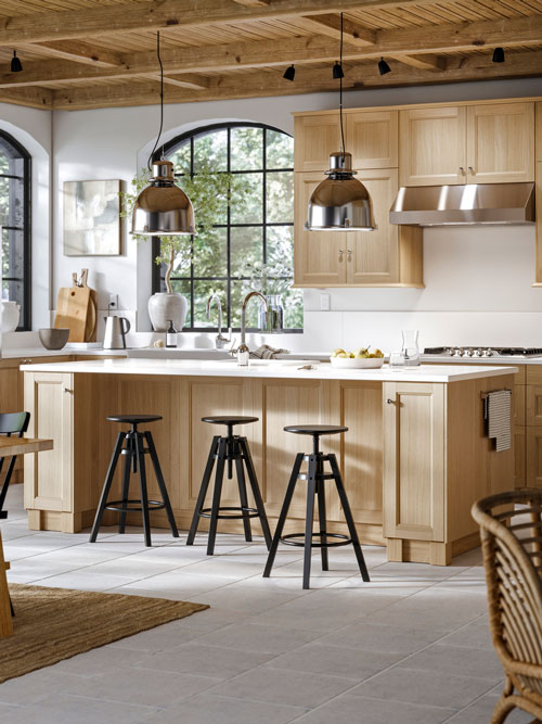 如果你想將櫃台板完全融入廚房布置,變成適合與親友歡聚或準備食材的空間,最好選擇半島形廚房工作檯。想布置更有特色、更舒適方便?加幾張與廚房面板相襯的椅子即可。