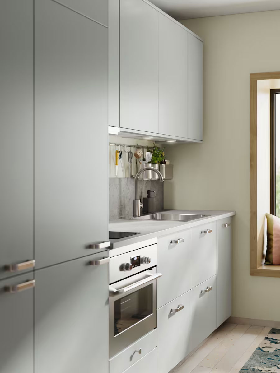 廚房面板結合簡潔線條與亮漆表面,感覺整齊又美觀。典雅雋永的淺灰色與你喜愛的顏色完美相襯,隨你打造專屬廚房。