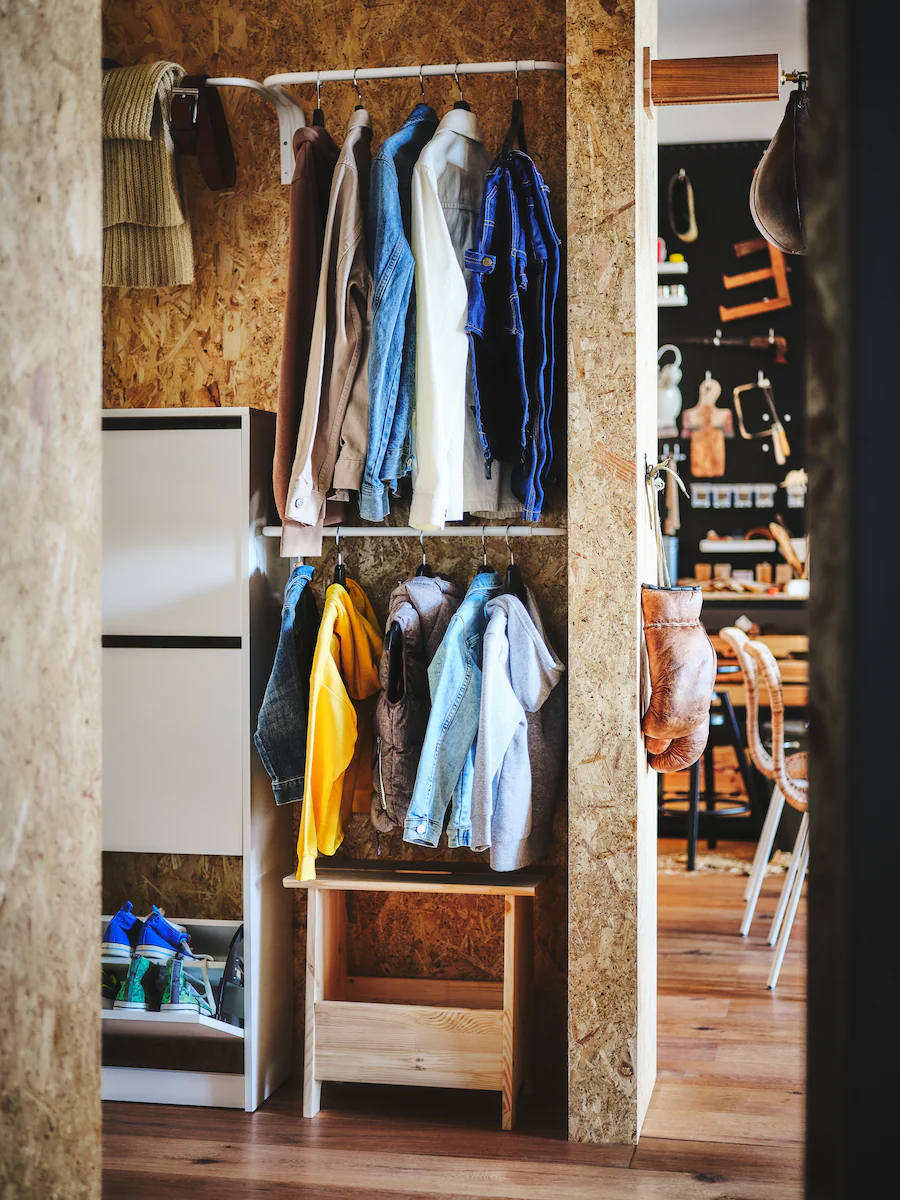 靈活移動的儲物傢具讓你能隨時拿取物品,例如為儲物盒添上活輪,便成為完美的方案,能配合忙碌生活的需要。另外別忘了要將層架、衣物掛桿和掛鈎的高度調低,方便小朋友使用。