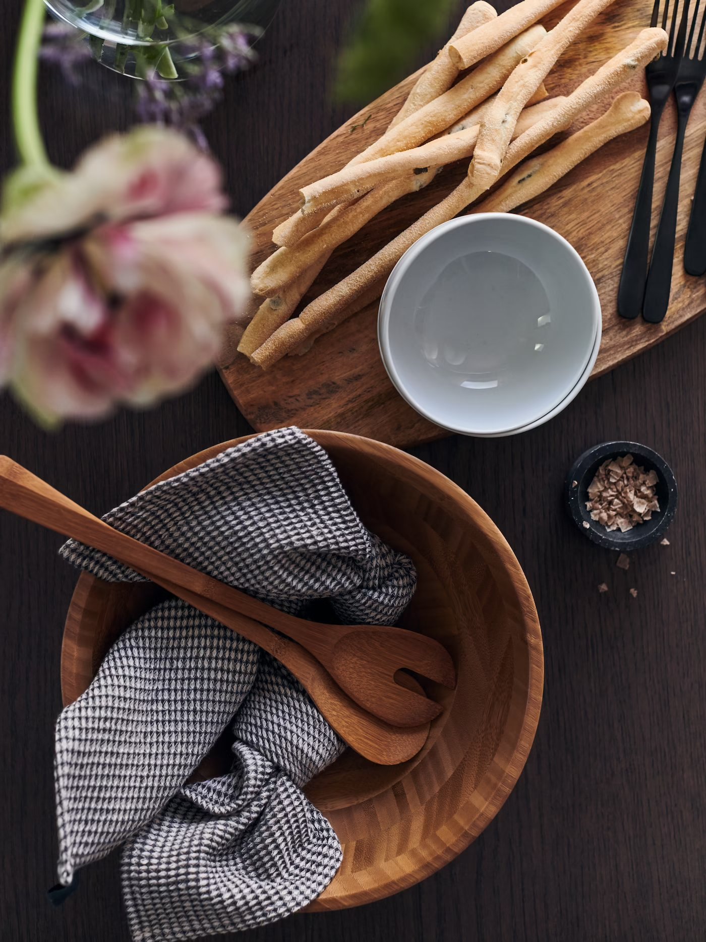 由Friso Wiersma設計的GRÖNSAKER沙律碗及杓Friso將自己的設計價值觀形容為「簡單直接地專注於物料本身和採用合適的結構」,這些是他在製作櫥櫃和造船時獲得的心得,現在他把這些原則應用到每件宜家家居產品之中,甚至小如沙律碗也不例外!他想透過沙律碗展示竹材的美態和可塑性,創造出獨特又美觀的形狀,手感良好。隨附的沙律杓也可以平放在碗上而不會滑落,這些貼心的小細節正是令日常生活變得更方便的秘訣。 |