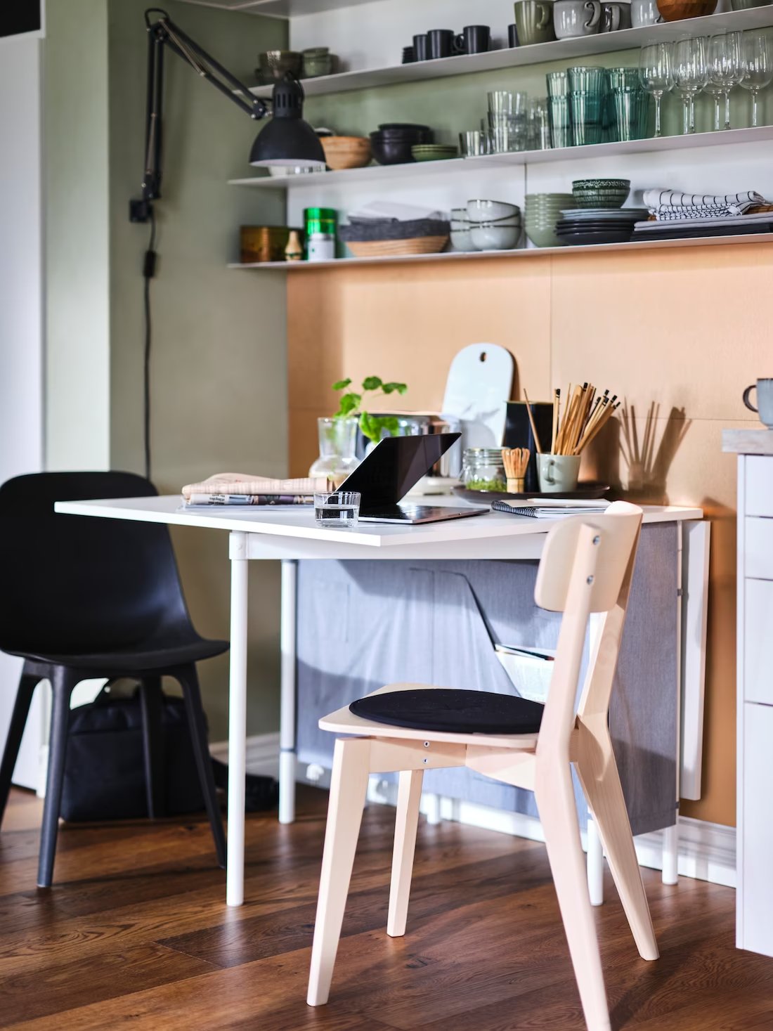 方便的開放式廚房雖然許多家庭會在吃飯時聊天交流,但這個家庭卻更喜歡動起來。摺板早餐檯適合快捷簡單地用餐,用完後也能輕易收起。 |