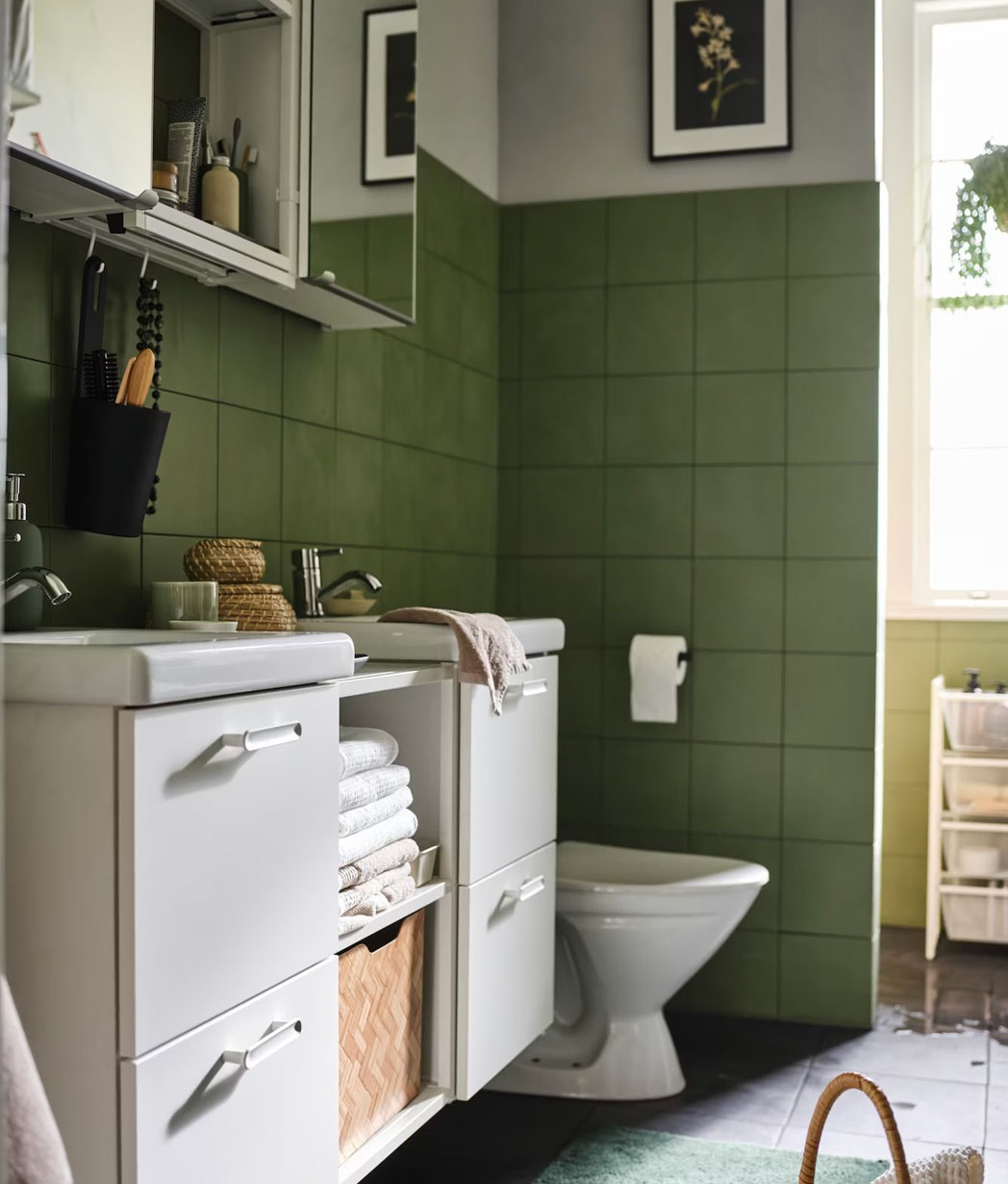 由於空間不多,家中的每個角度都能發現巧妙的儲物方式。在浴室內,寬敞的層架組合可以擺放待洗衣物,獨立儲物箱則收納每位家庭成員的清潔用品。如果迅速梳洗更衣是一項運動,這個家庭必定是精英選手。
