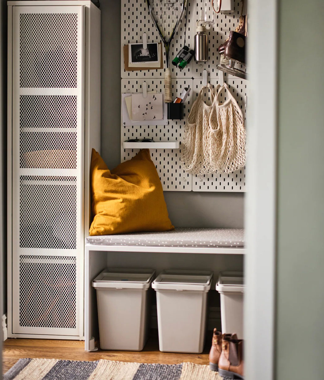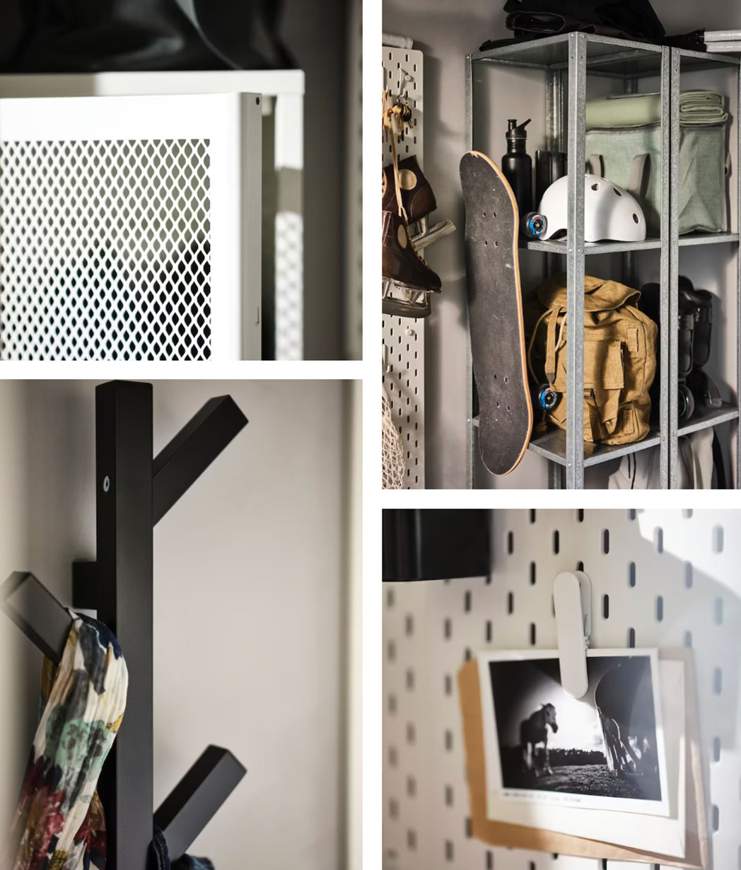 即使玄關空間狹小,只要加入掛鈎、掛桿和層架,門口立即變得整齊又實用。