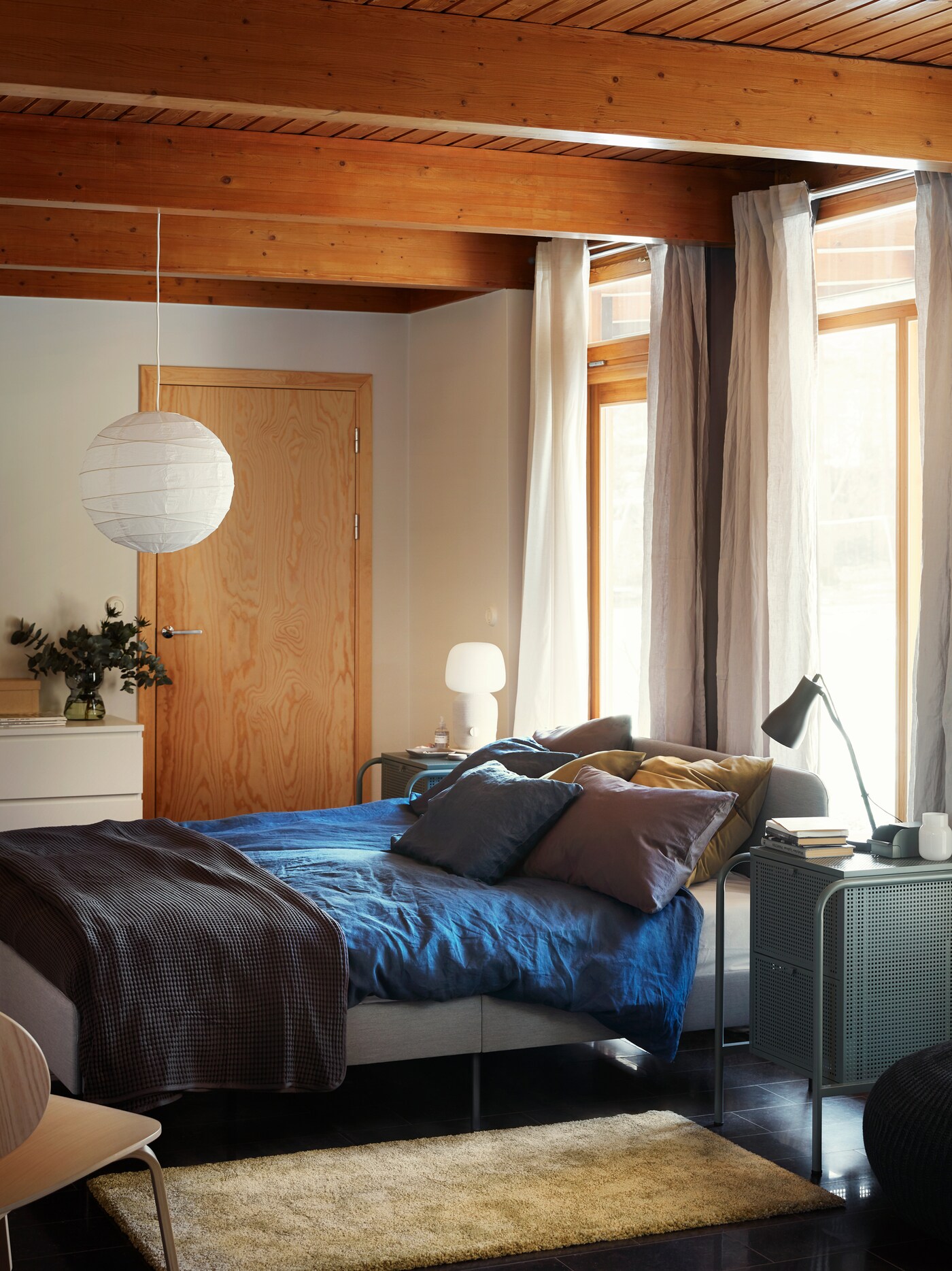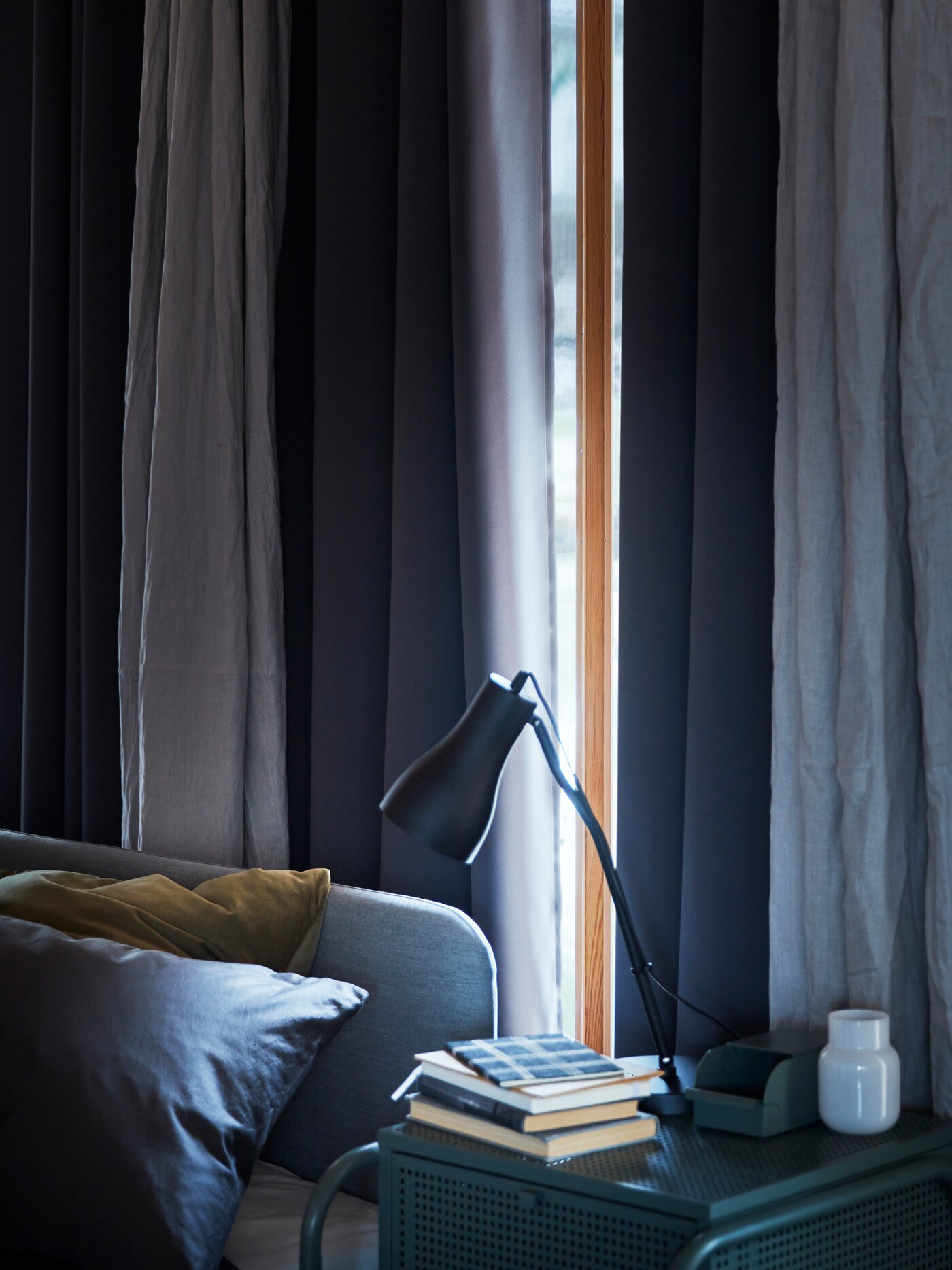 無論街燈或陽光,HILLEBORG遮光窗簾都能一一隔開。這款窗簾以回收PET塑造製造,令布料不但柔軟而平均地垂下,而且更加環保。若想營造更柔和的氣氛,也可安裝多層窗簾。