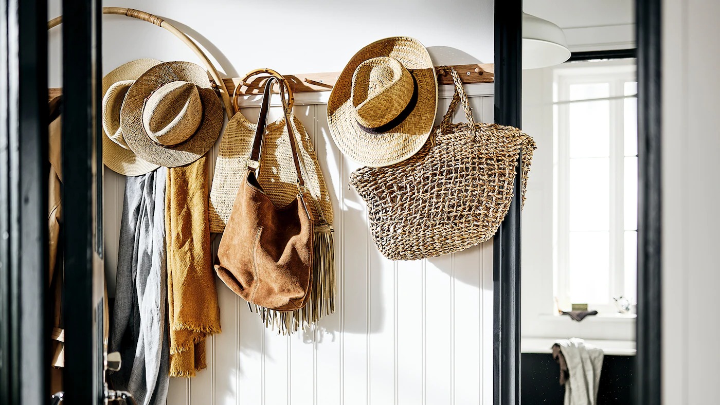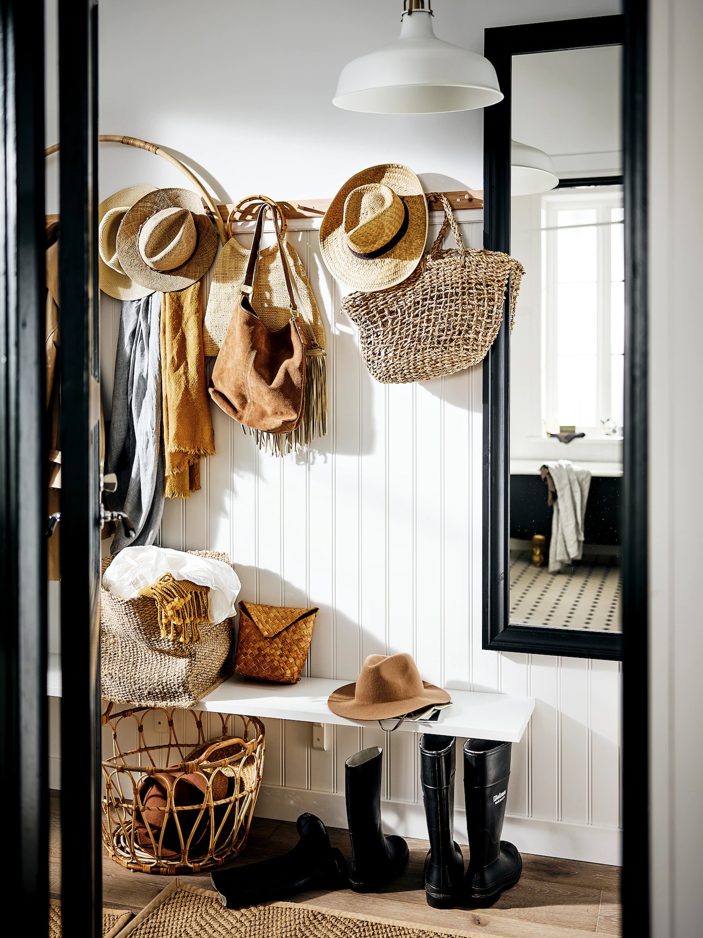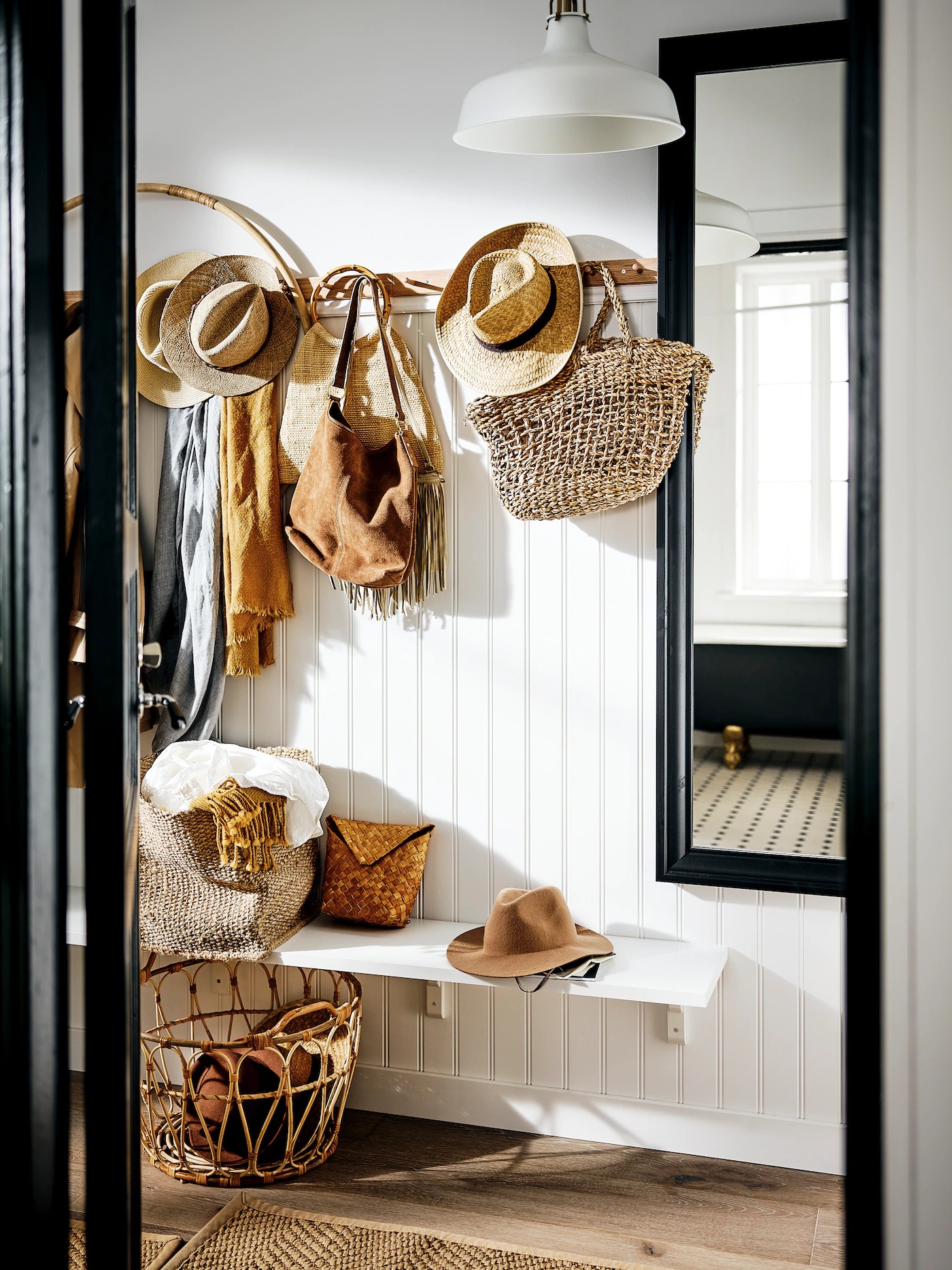 當沒有足夠的空間擺放大型儲物傢具,大可善用牆壁空間。這個玄關以六頭掛鈎木架和矮層架,打造散發鄉村氣息的多用途儲物空間,方便迅速拿起所需的物品出門。