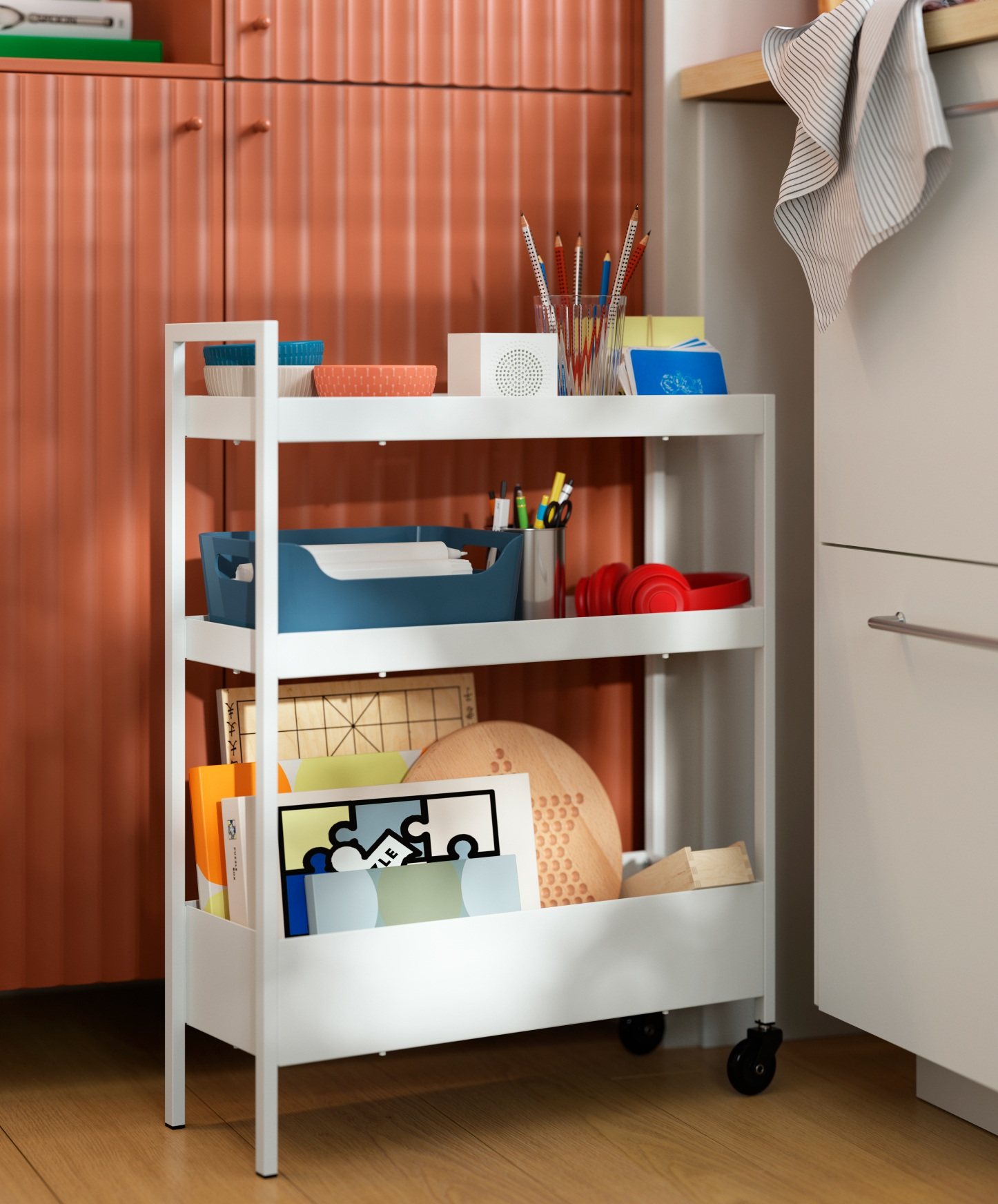 一車多用,適用於狹小空間,可隨時搬到任何所需地方,用作額外儲物空間,方便收納餐具、書枱配件等物品。此產品符合穩定、耐用和安全度標準,經久耐用。