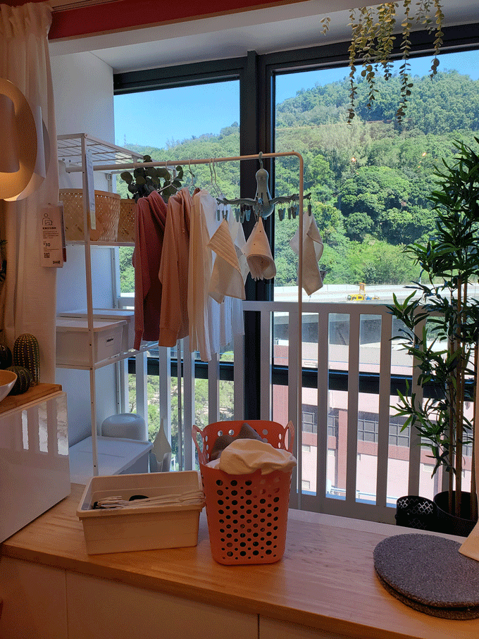 在露台的一角添置JOSTEIN 層架組合連曬衣架,節省空間之餘,也能存放衣物和洗衣配件。當然也可以加入一些綠色植物,注入清新綠意。