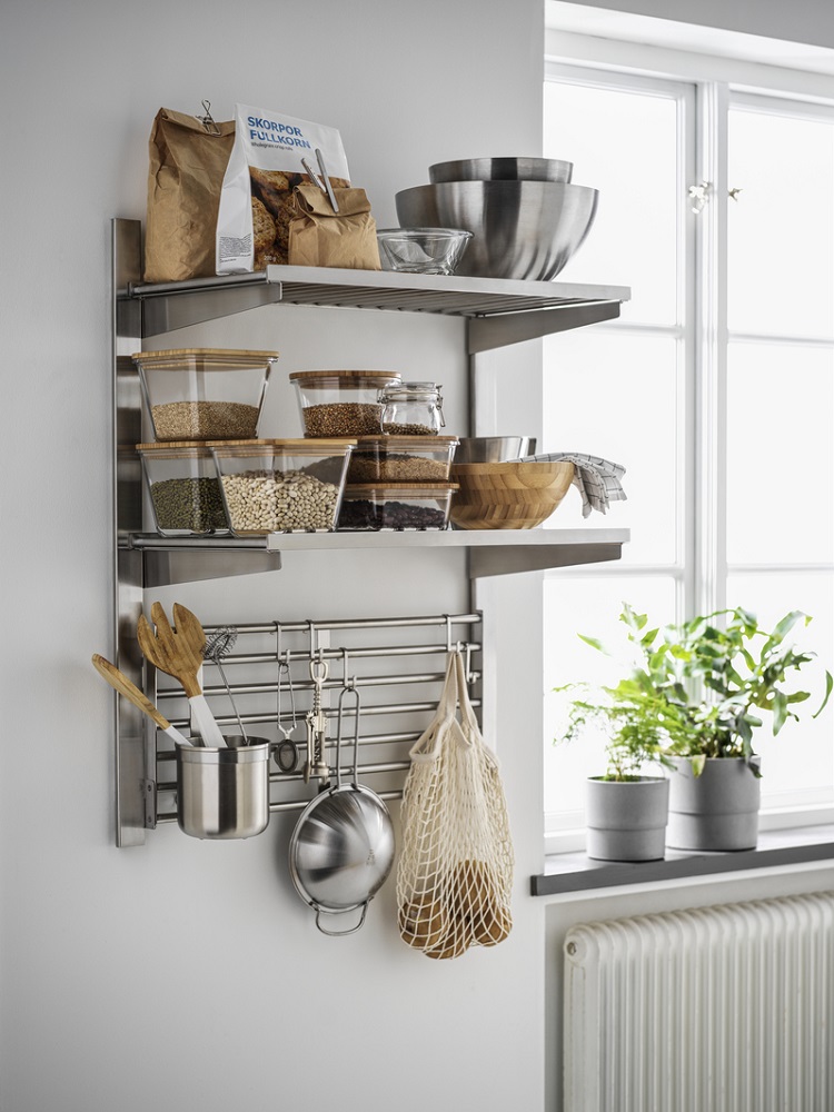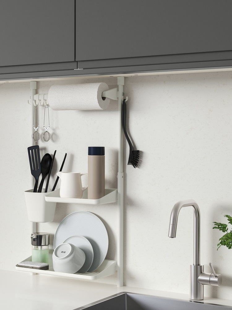 利用牆面空間讓收納更有彈性,磁性刀架、掛牆架、掛勾、收納容器,讓你在廚房能看清楚所有物品,隨手方便拿取,擁有更多工作空間。