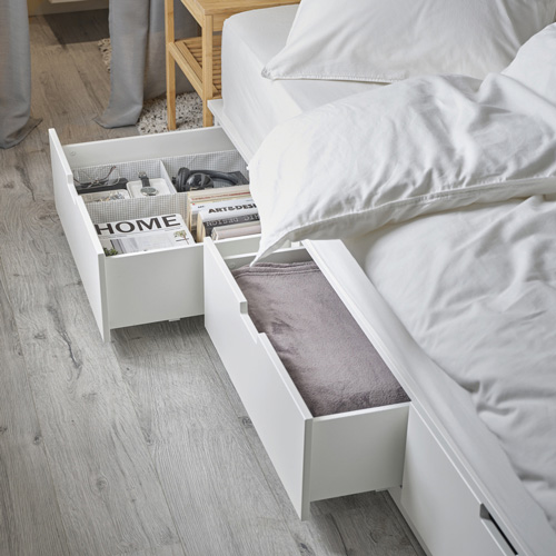 想用盡睡房的空間?床底儲物便是你的最佳選擇,特大的抽屜將衣服和寢具收納妥當,如果沒有空間擺放床頭几,不妨選用連層架的床底儲物箱,既能將睡眠必備的用品放近床邊,白天也能輕鬆藏起。