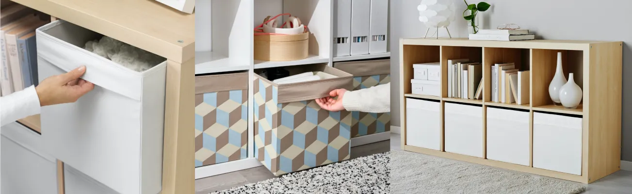 布材質地的貯物箱兼具時尚和功能性,無論放在書櫃或衣帽間也很合適。 尺寸適合放在KALLAX層板組合內使用,成分多為回收再造的聚酯纖維