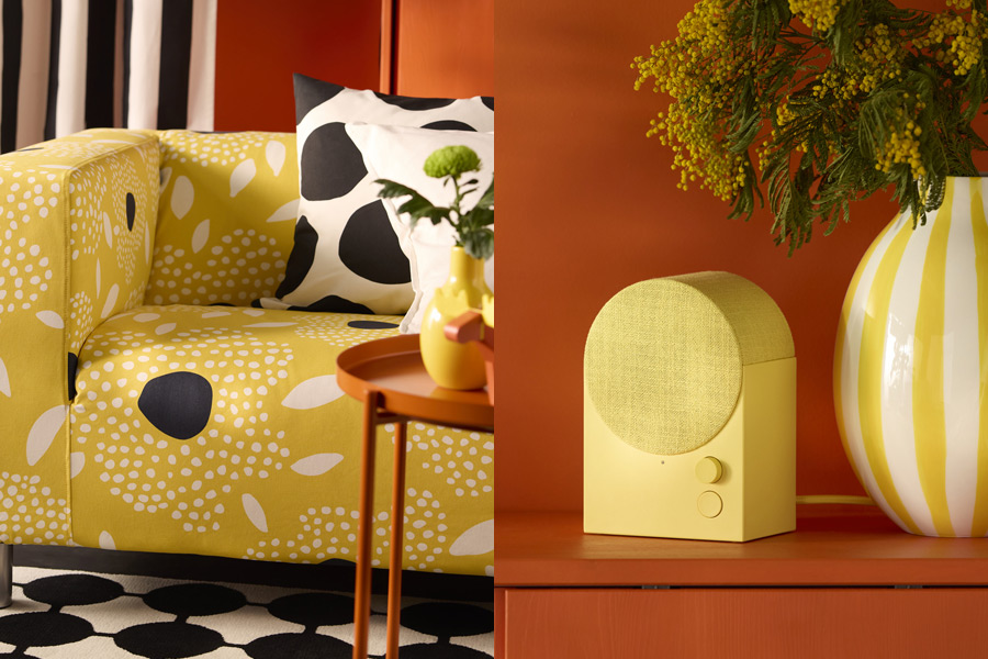 黑白色布置配上黃色點綴,例如BLODBJÖRK花瓶和 NATTBAD藍芽喇叭,令整個空間更加明亮活潑。試試混搭條紋和波點圖案的布藝產品(當然可以),並為實用的KLIPPAN梳化換上全新的花朵圖案梳化套,打造放鬆休息的完美空間。