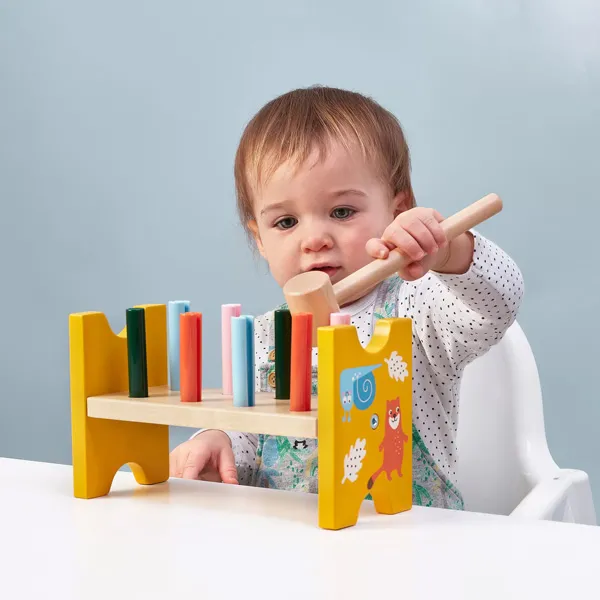 玩具鎚子不止有趣,而且適合用來鍛鍊手腕。小朋友可以用它來鎚打一排排的椿子,或者是每次鎚打相同的顏色的椿子