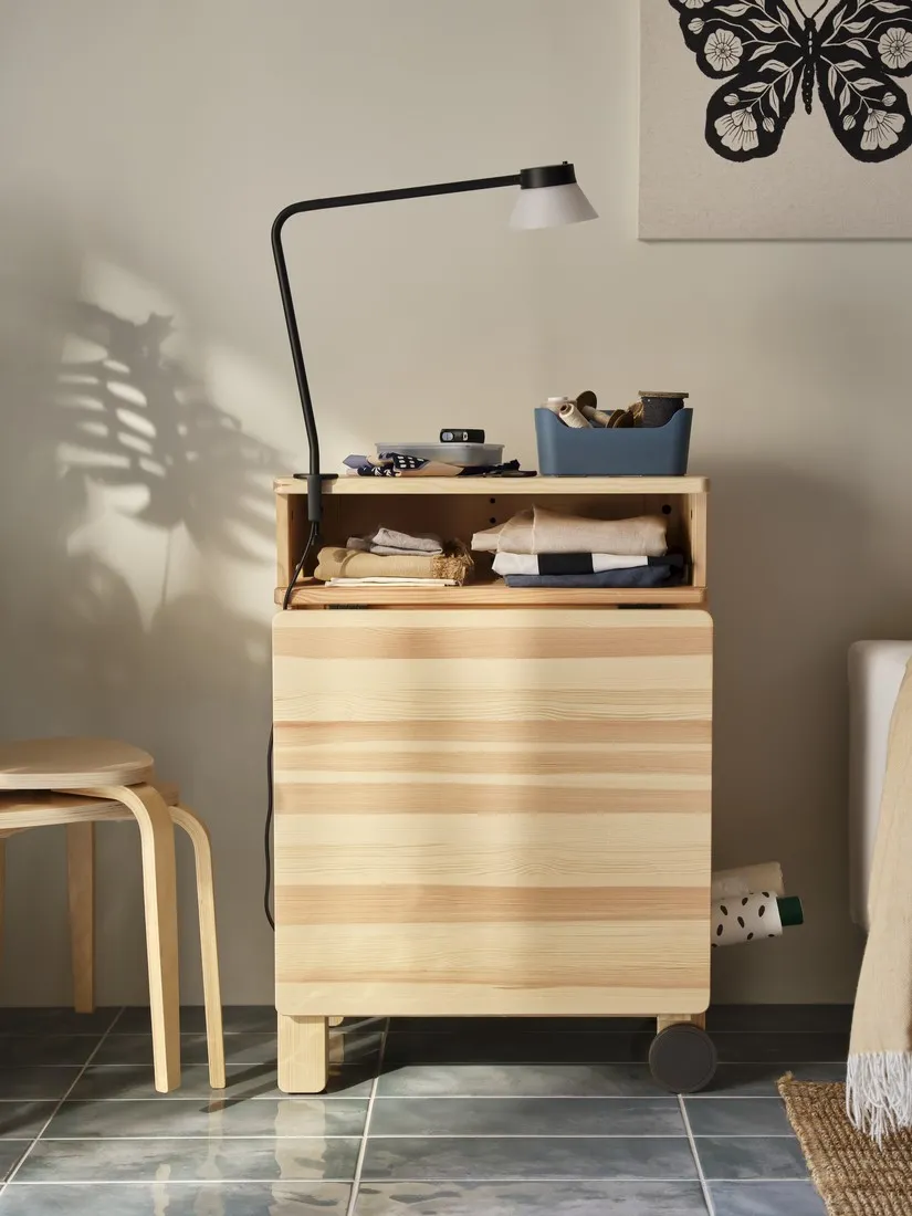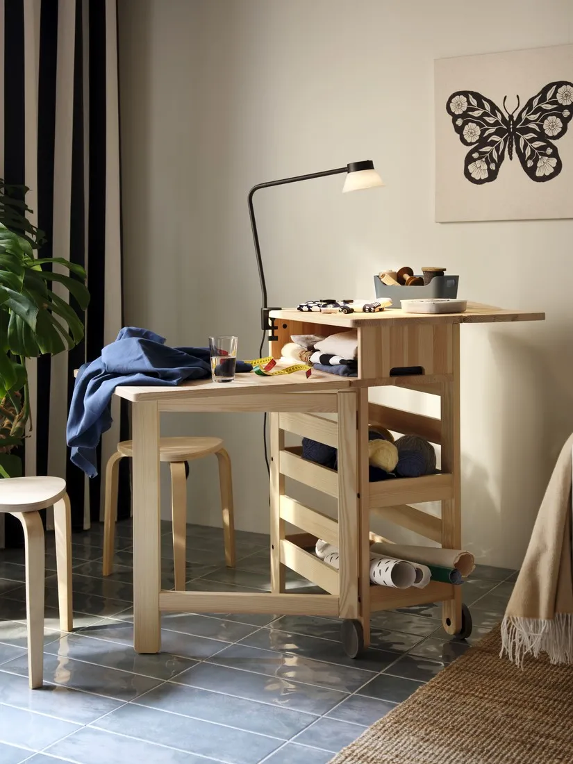 靈活便利的 RESARÖ 活動摺板檯,適合多種空間需求;靠牆收起時低調樸素,展開後呈現全然不同的實用面貌,非常適合各種需要用完就收的興趣和活動。 放置在家中一角,打造多用途又便利的創作區;推到需要的位置,放下桌板、拿出原本堆疊收納的 KYRRE 椅凳,就能開始使用。 恰到好處的高度與開放式配置,創作時依舊能陪伴(和觀察)一旁玩耍的孩子,家庭時光更美好安心。