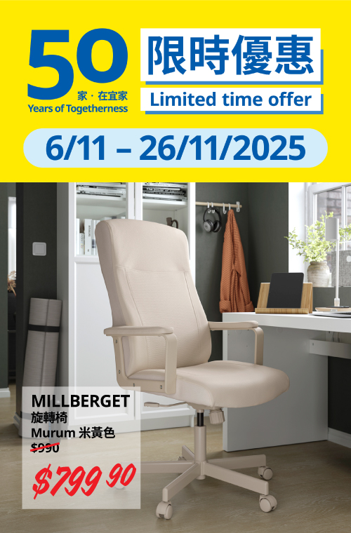 IKEA提供多種電腦椅類型,具有感壓煞車裝置的安全椅腳;符合人體工學的電腦辦公椅,以支撐你的背部傾斜施力程度,坐得舒服,在家工作也能更有效率。