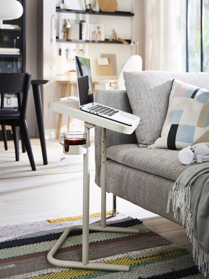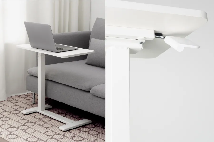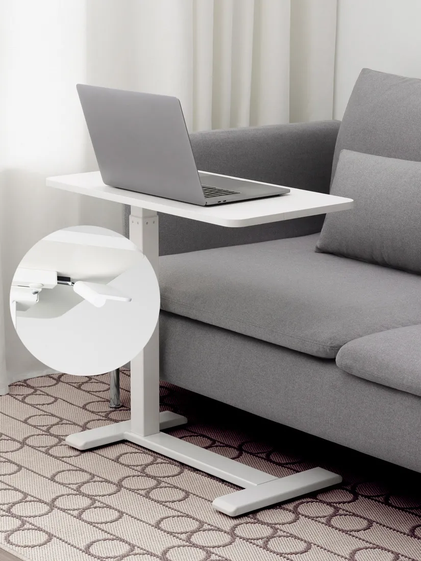 BOLLSIDAN升降式電腦枱使用氣壓設計調校高度,不必連接電線,方便移動,可坐著或站著工作,給身體伸展的機會,提升工作效率。扁平腳架設計,並附隱藏滑輪,可輕鬆伸入梳化底和床底。