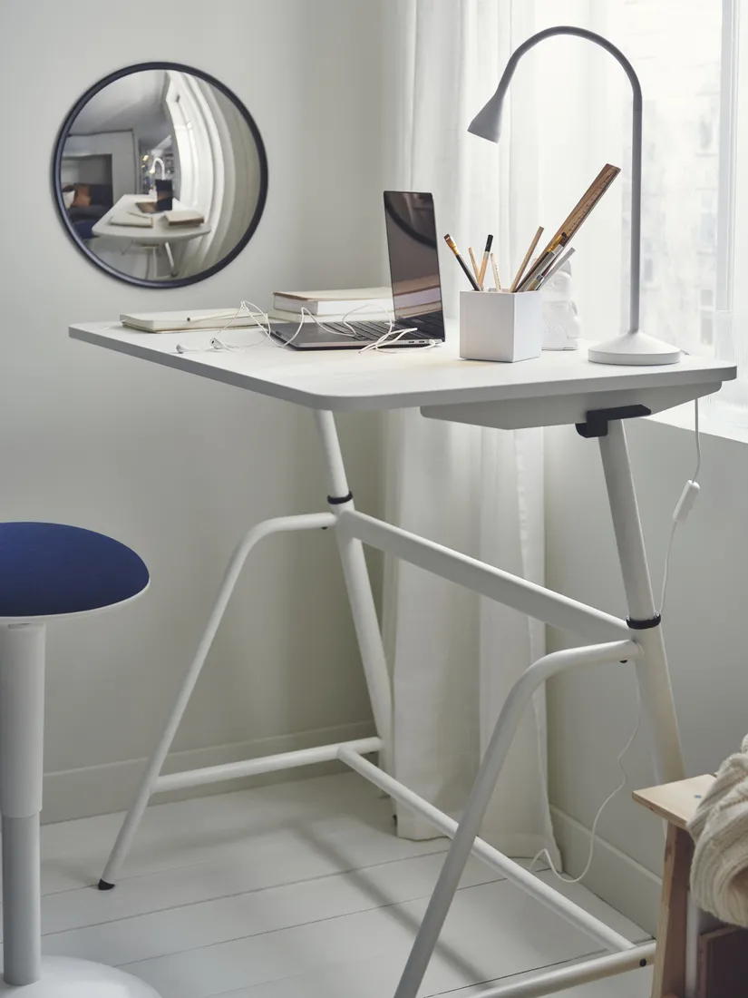 BOLLSIDAN 電腦枱採用氣壓式升降系統,操作安靜順暢,無需插電即可輕鬆調整高度。無論在家中任何角落,都能打造一個舒適、靈活又時尚的工作空間,讓你隨時隨地高效工作或輕鬆休閒。