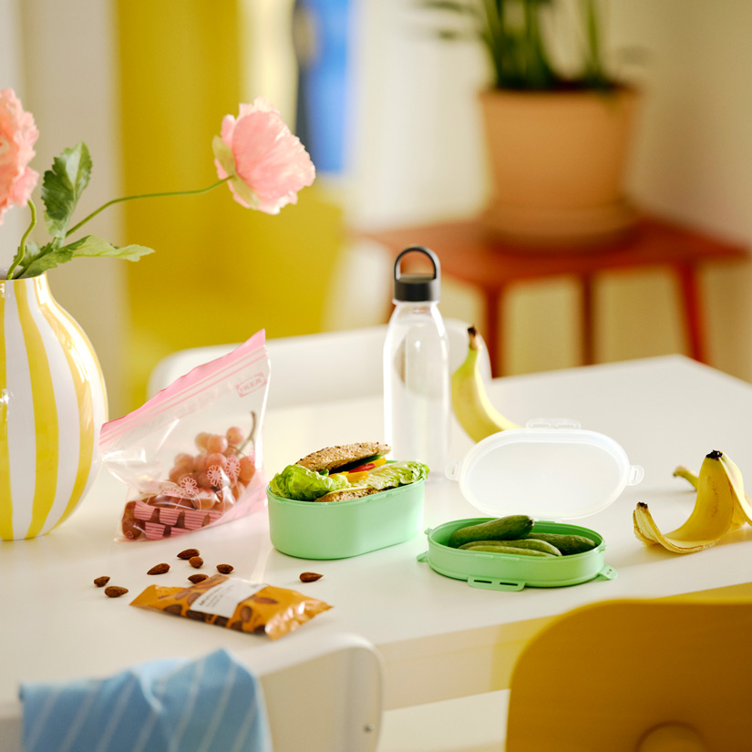 小朋友不會吃賣相欠佳的食物,例如單調乏味又濕軟的三明治。IKEA的食物盒能鎖住各種食物的鮮味,就像剛煮好一樣美味。內置的間隔可將不同食物隔開,避免主食與沙律或蔬菜混合在一起。堅固的塑膠盒身能放進手袋和背包,以免食物變形,而且長方形盒身非常適合放入雪櫃,不會像膠袋一樣倒下或被壓扁,更可以放入微波爐、冰櫃和洗碗碟機。